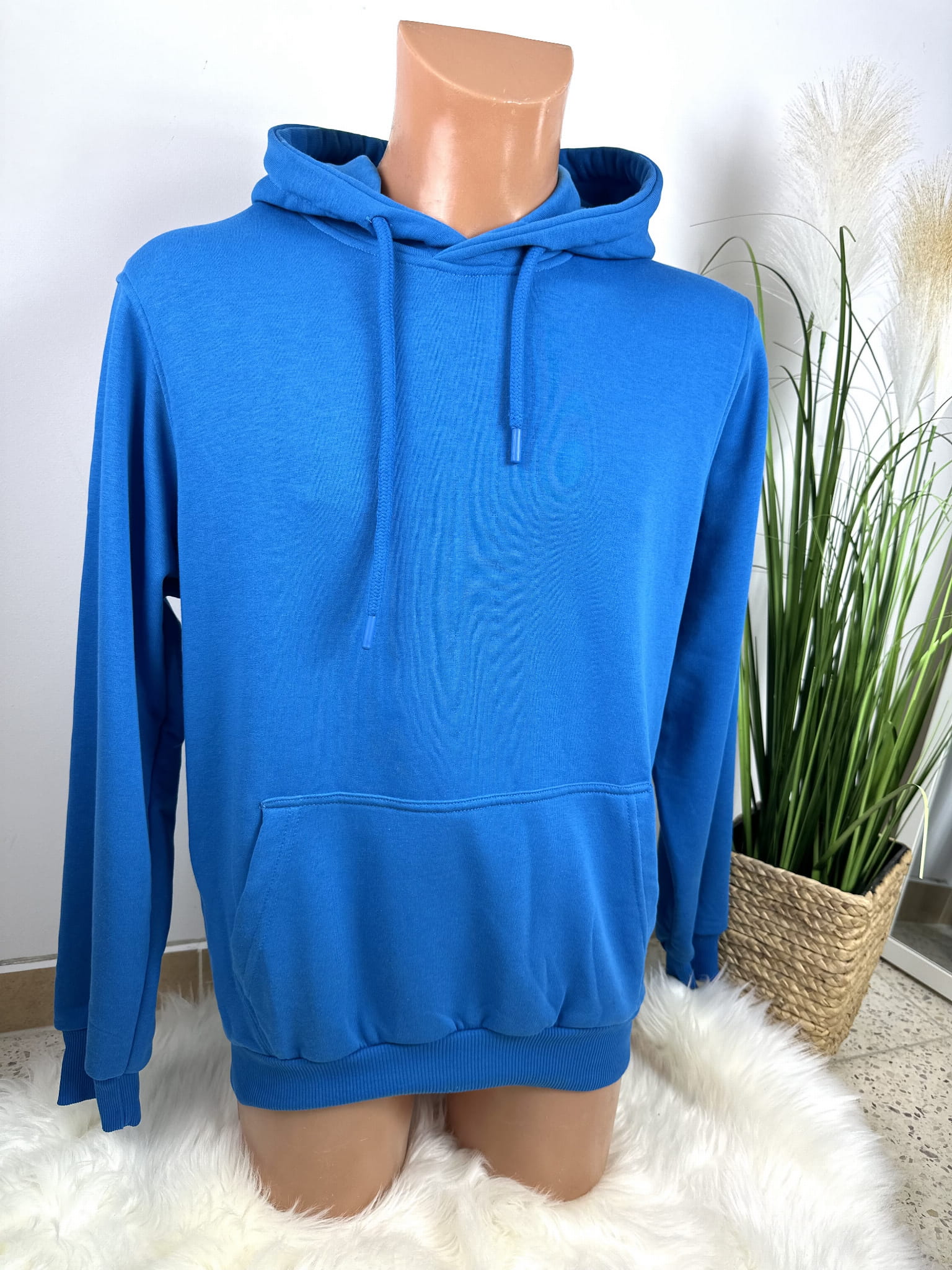 Bluza z kapturem jest wkładana przez głowę. Posiada regulowany kaptur oraz praktyczną kieszenią typu kangurka z przodu. Sportowego charakteru nadaje jej prosty klasyczny fason oraz wykończenia. W pasie i na zakończeniach rękawów posiada ściągacze w tym samym kolorze. Wykonana została z miękkiej, gładkiej dzianiny dresowej, w jednolitym kolorze. Gładka, klasyczna, nierozpinana bluza z kapturem sprawdzi się o każdej porze roku i w prawie każdych okolicznościach.