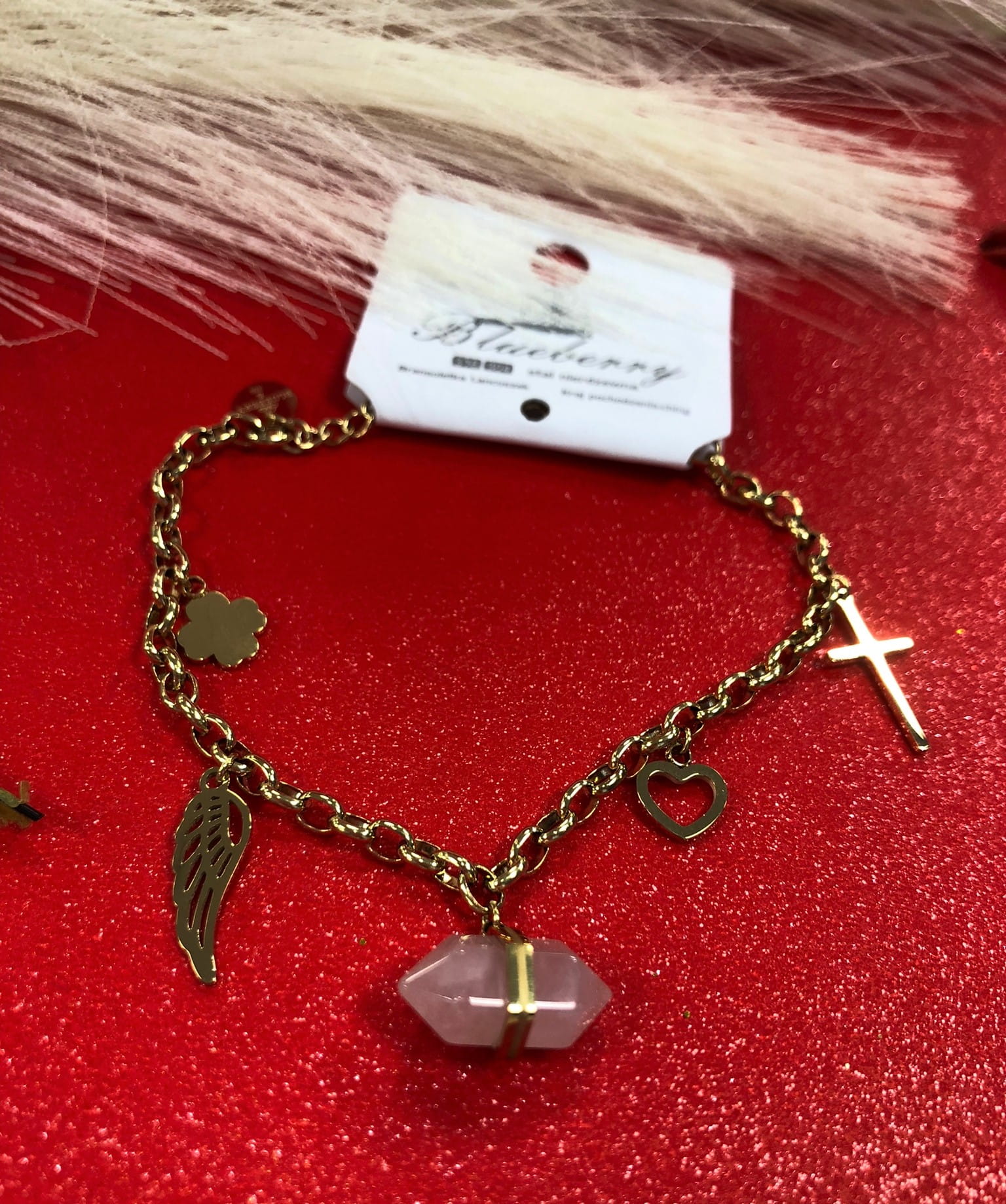 Bransoletka z kamieniem i zawieszkami: krzyżyk, serce, koniczyna, skrzydło