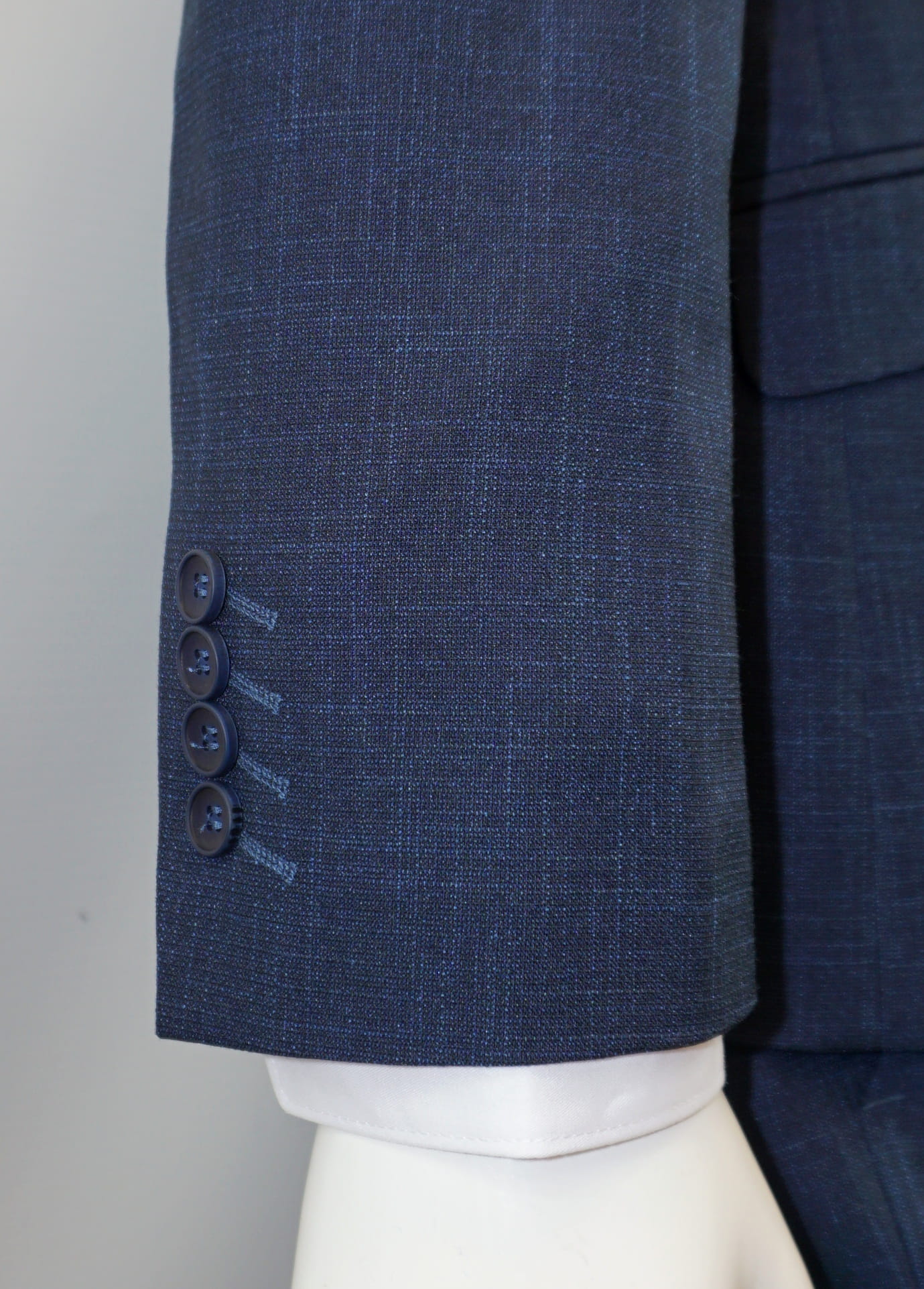 Marynarka jednorzędowa, zapinana na dwa guziki. Posiada dwie zewnętrzne kieszenie z klapkami i trzy wewnętrzne. Model posiada dwie szlice (rozcięcia) z tyłu. Kontrastowa pliska na brustaszy to charakterystyczny akcent. Miękka konstrukcja i lekkie wypełnienie ramion oraz przodów marynarki zapewnia naturalne ułożenie.