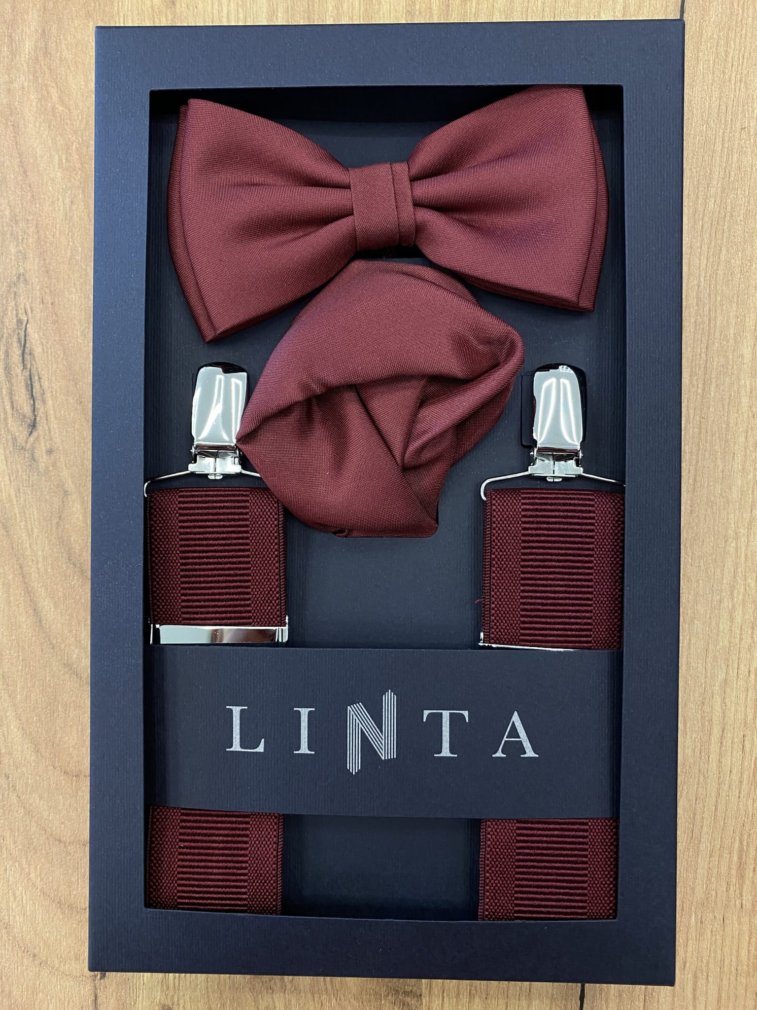 Zestaw muszka + poszetka + szelki.