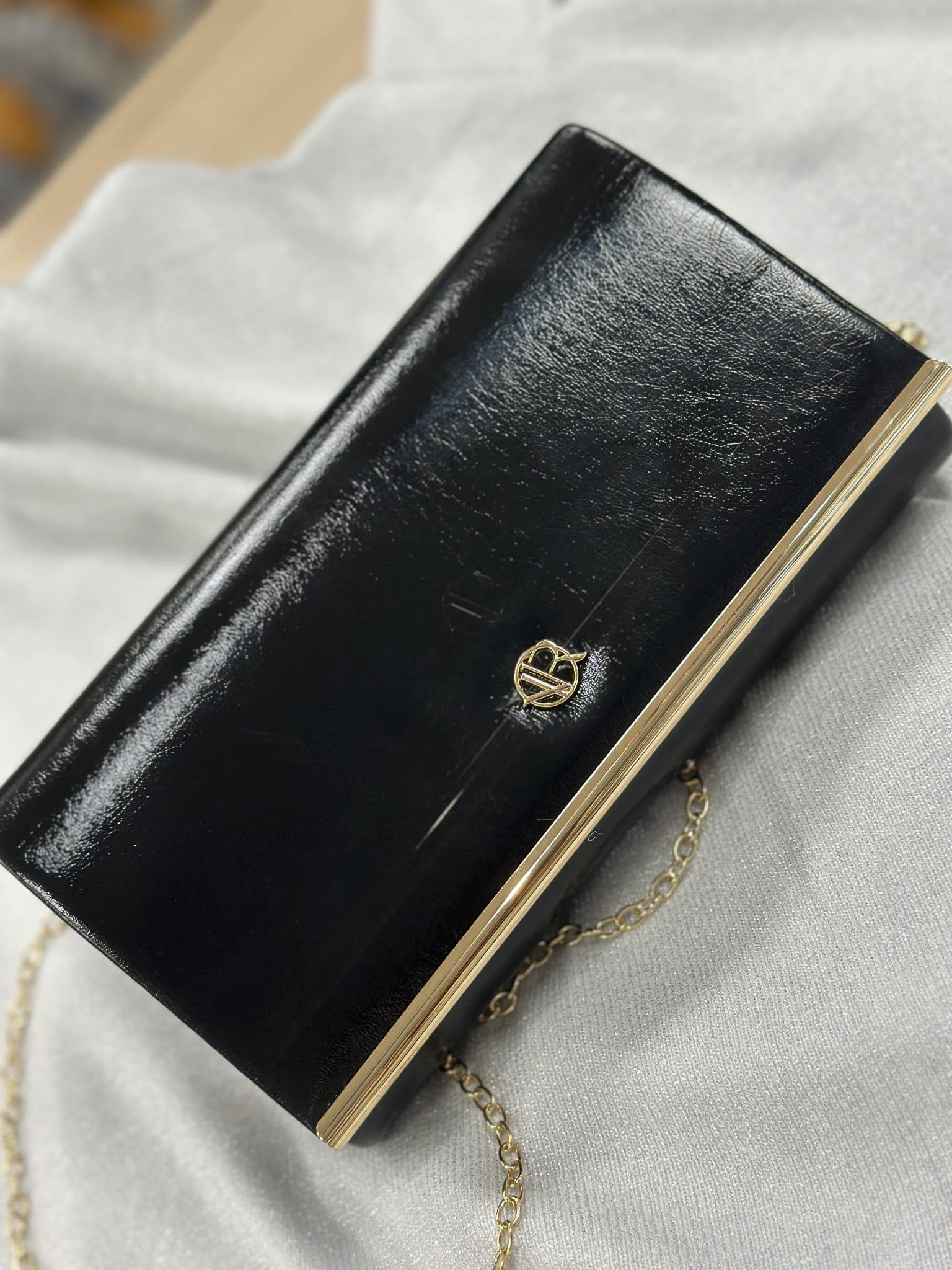 Piękna, świecąca kopertówka z metalową lamówką dodającą szyku.