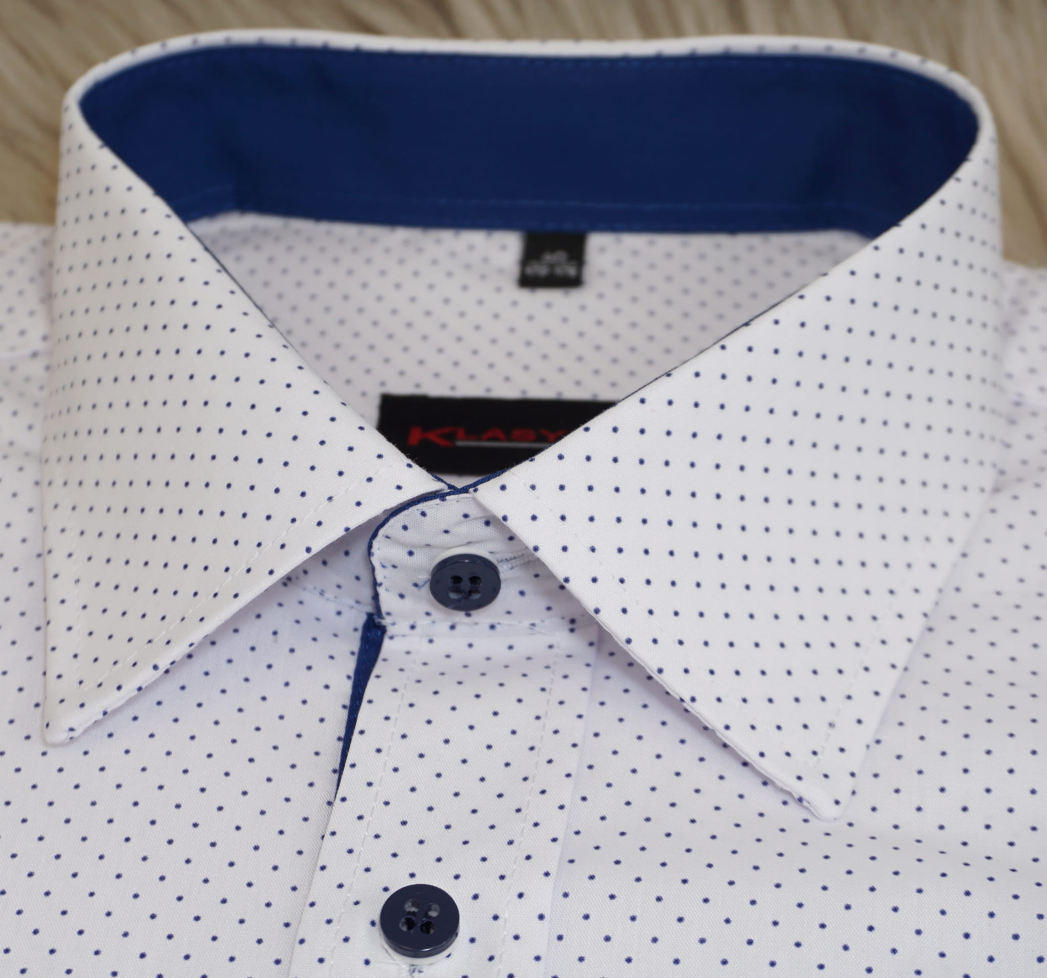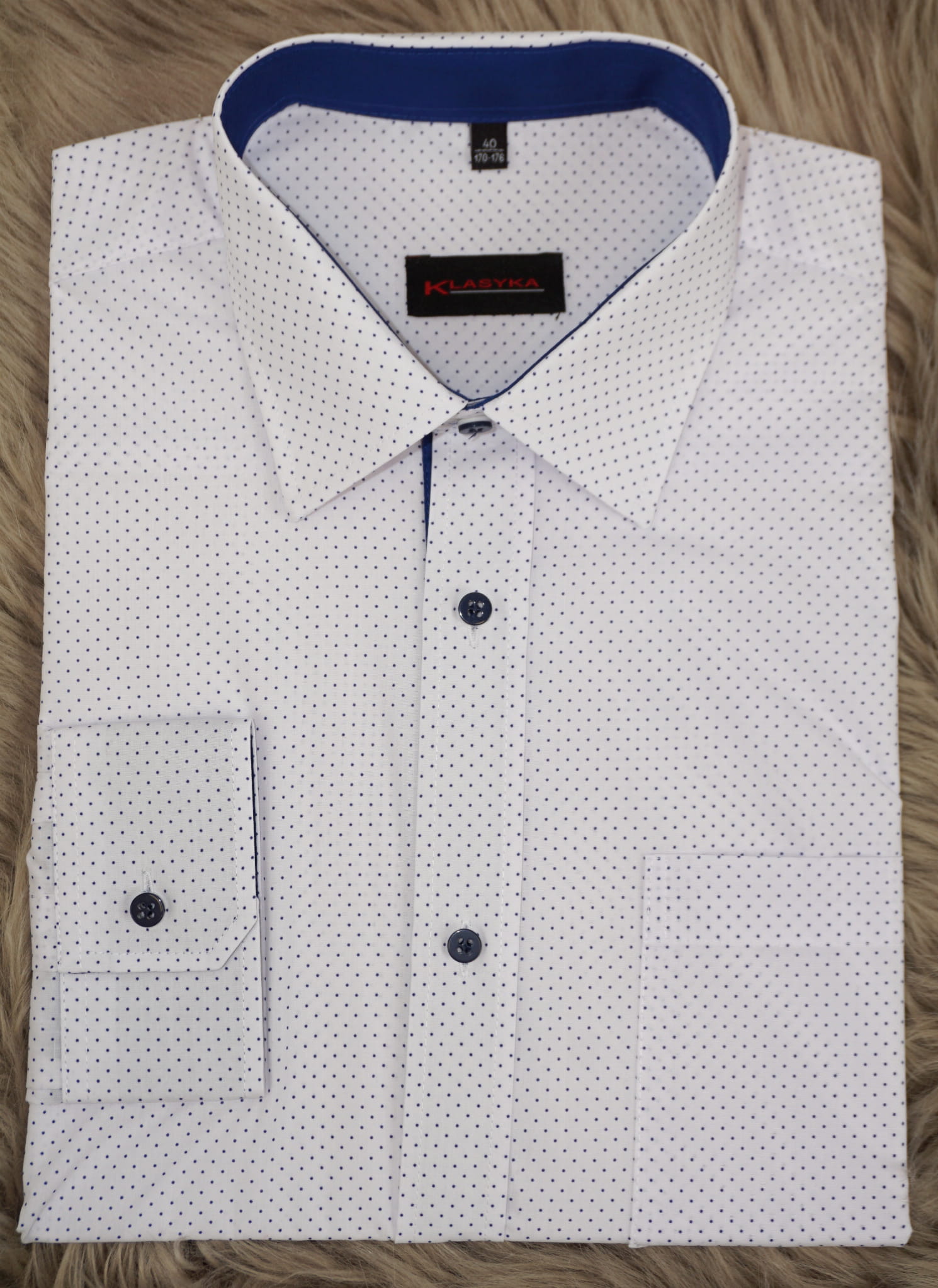 Koszula biała wizytowa w niebieskie kropki z kieszonką na piersi.