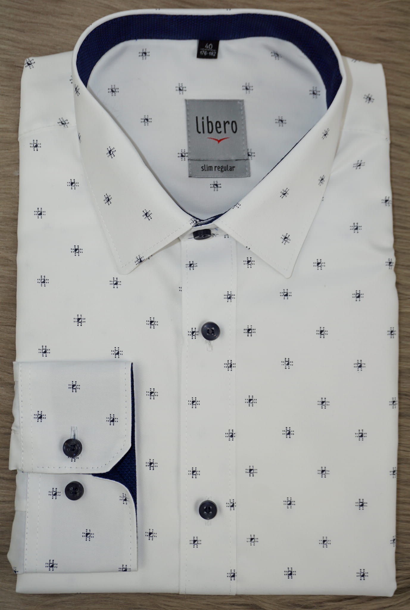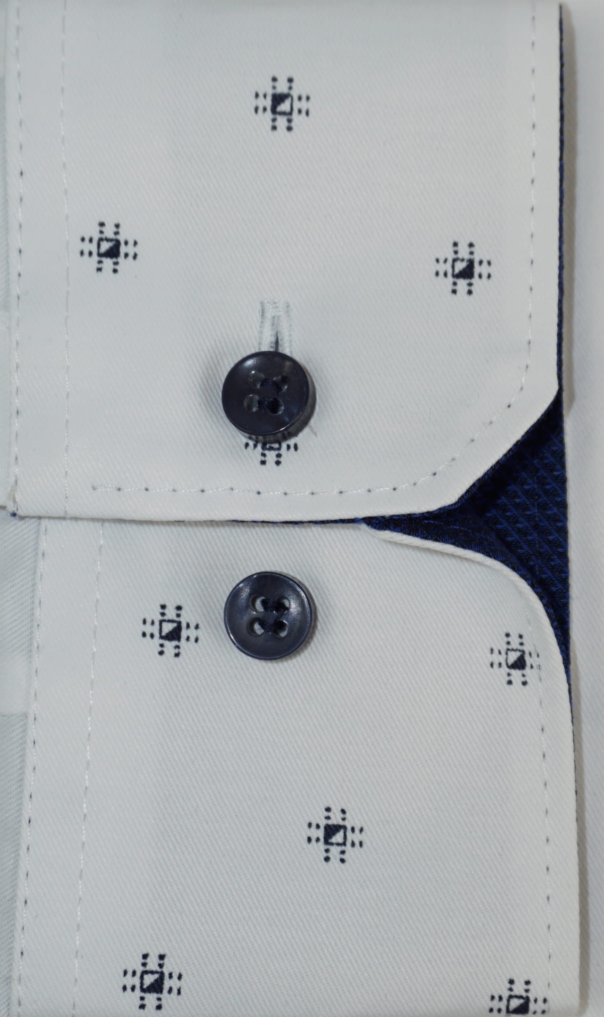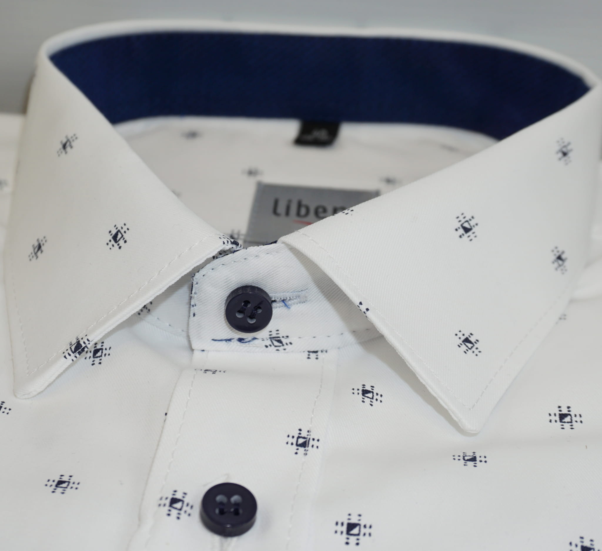 Koszula biała, elegancka w unikalny granatowy wzór i kontrastowe guziki.