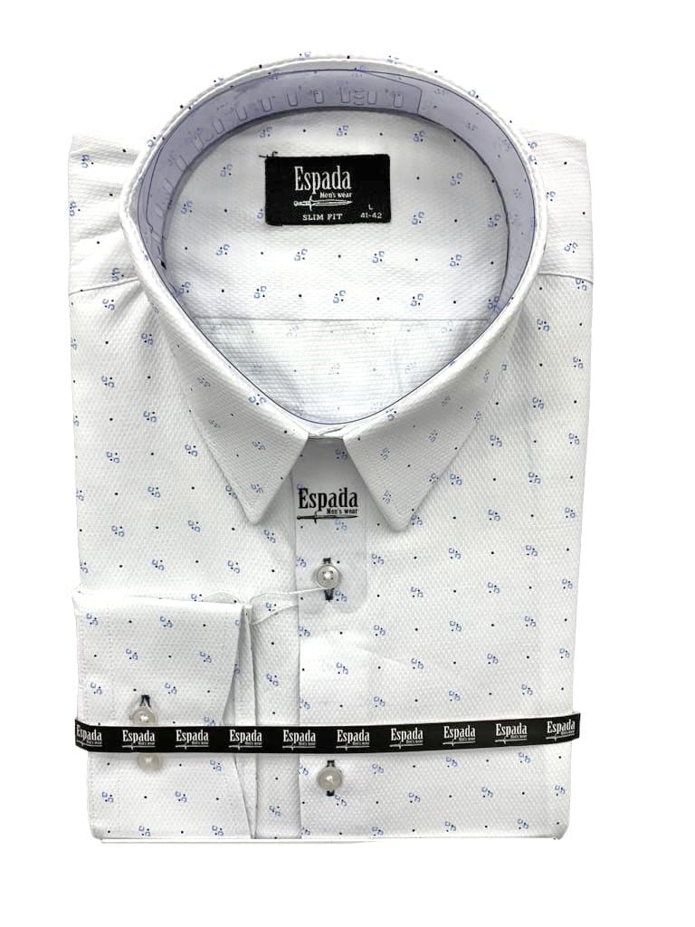 Koszula męska długi rękaw biała fakturowana w błękitne kółka SLIM