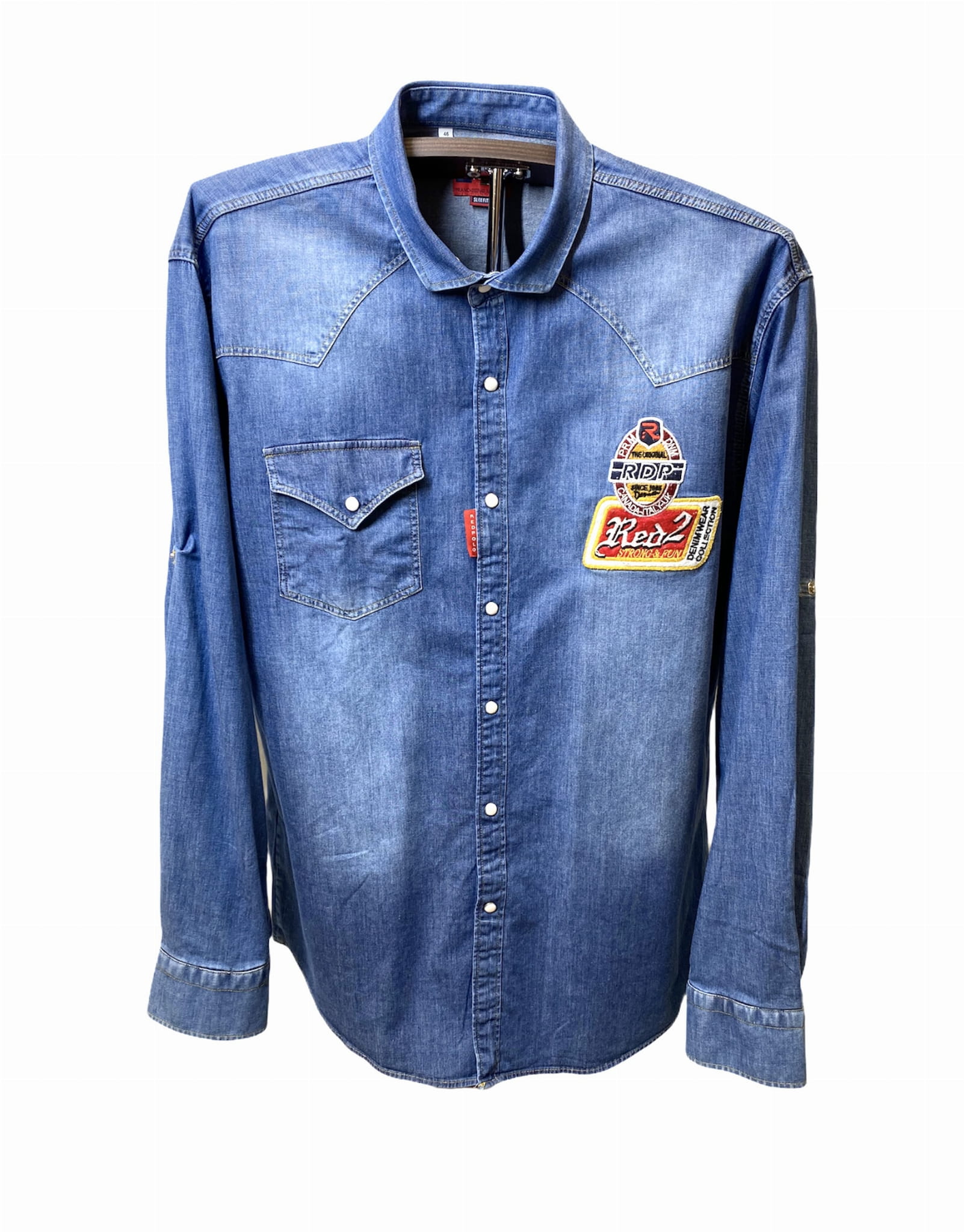 Koszula męska jeansowa z ozdobnymi naszywkami z przodu.