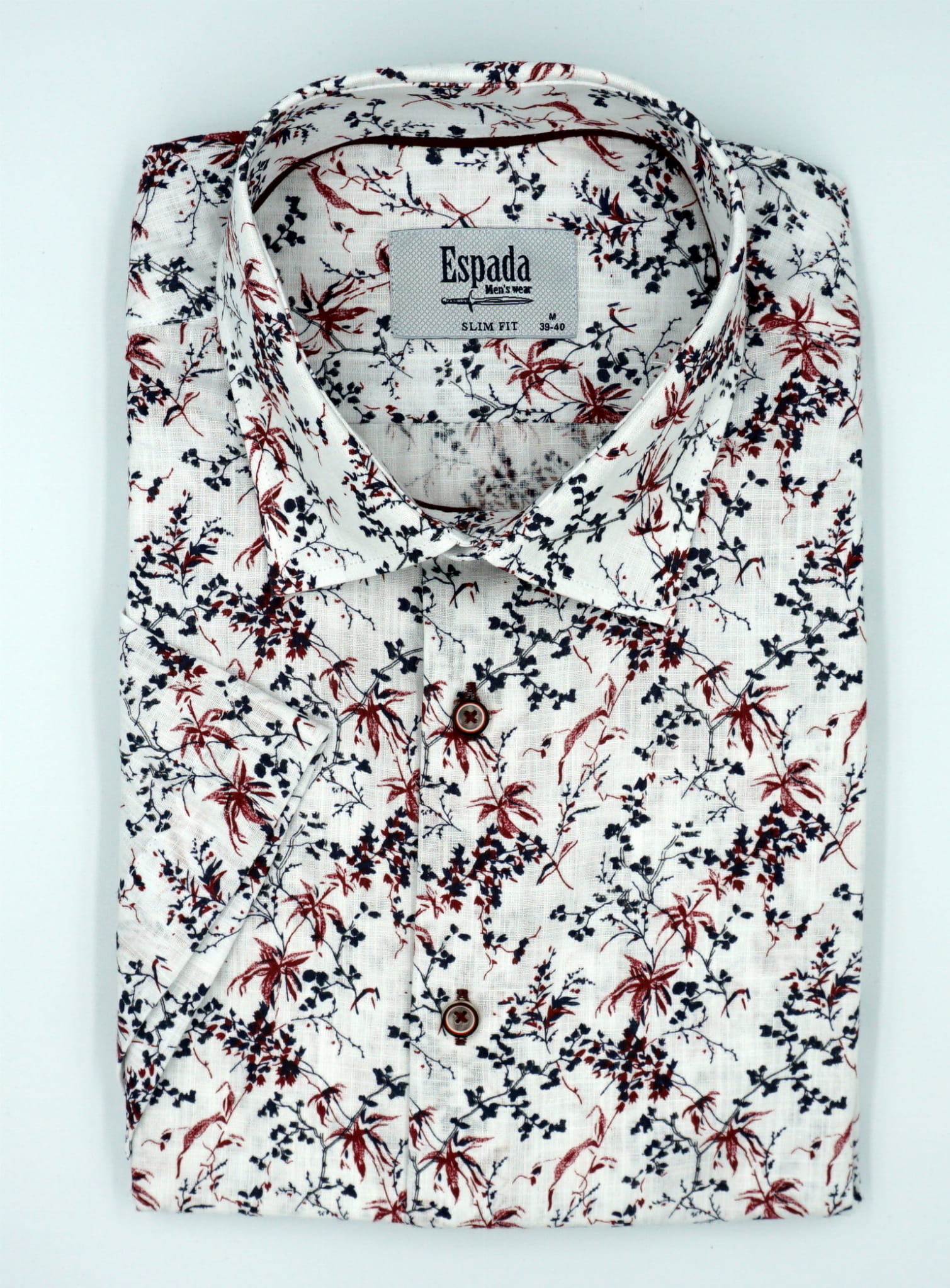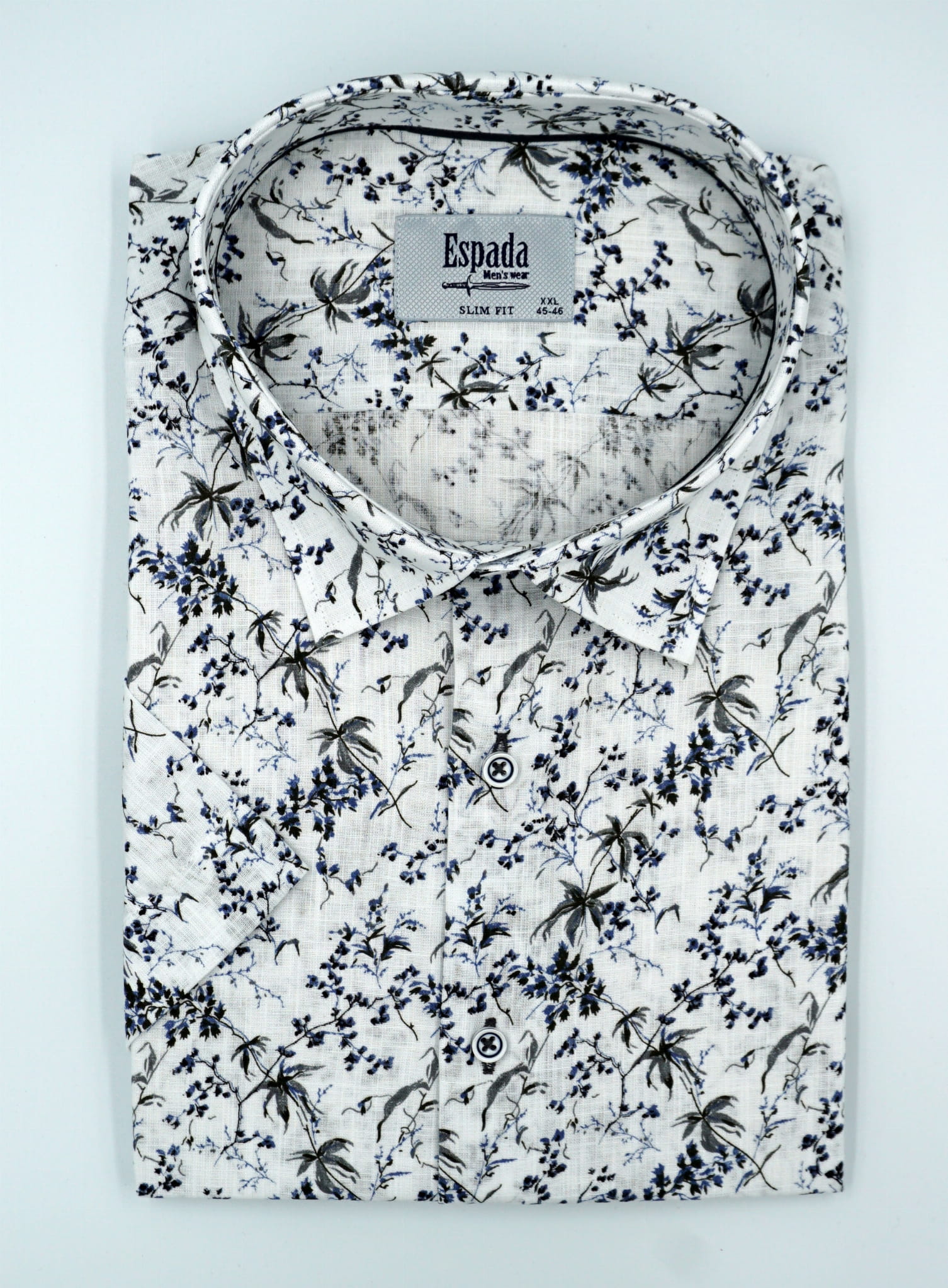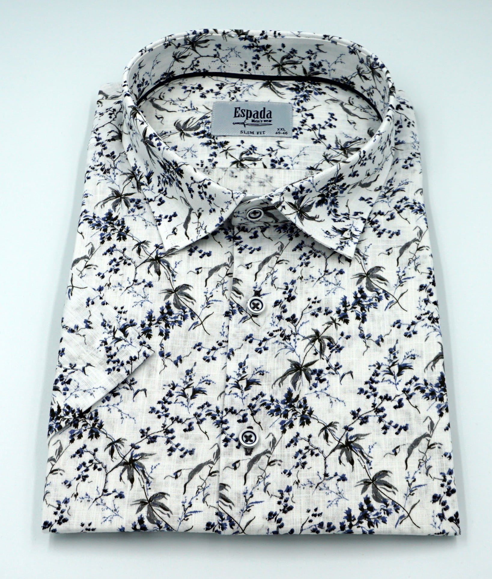 Koszula męska krótki rękaw a'la len w kwiaty slim fit