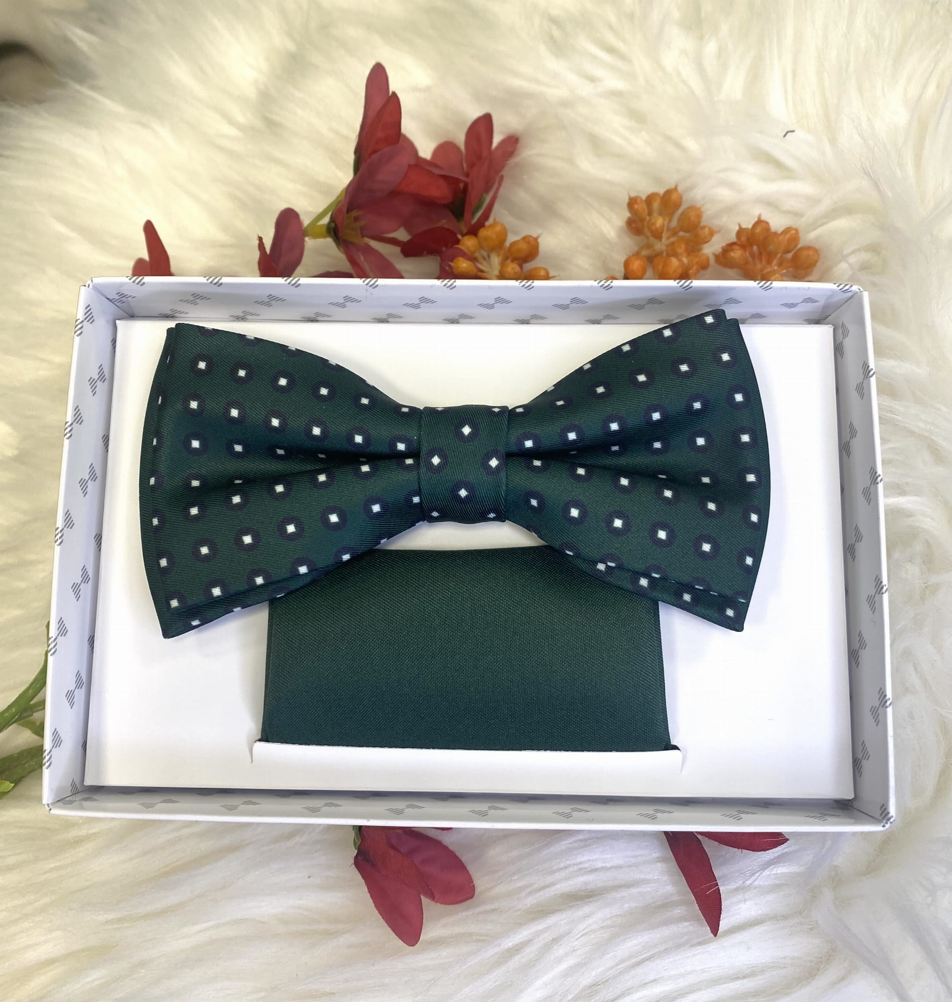 Mucha w zestawie z poszetką, zapakowana w pudełko.