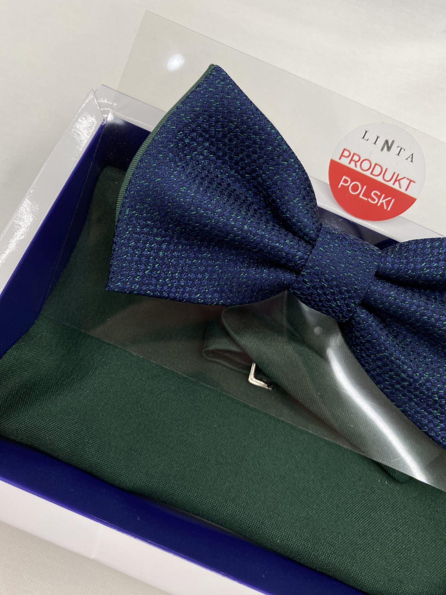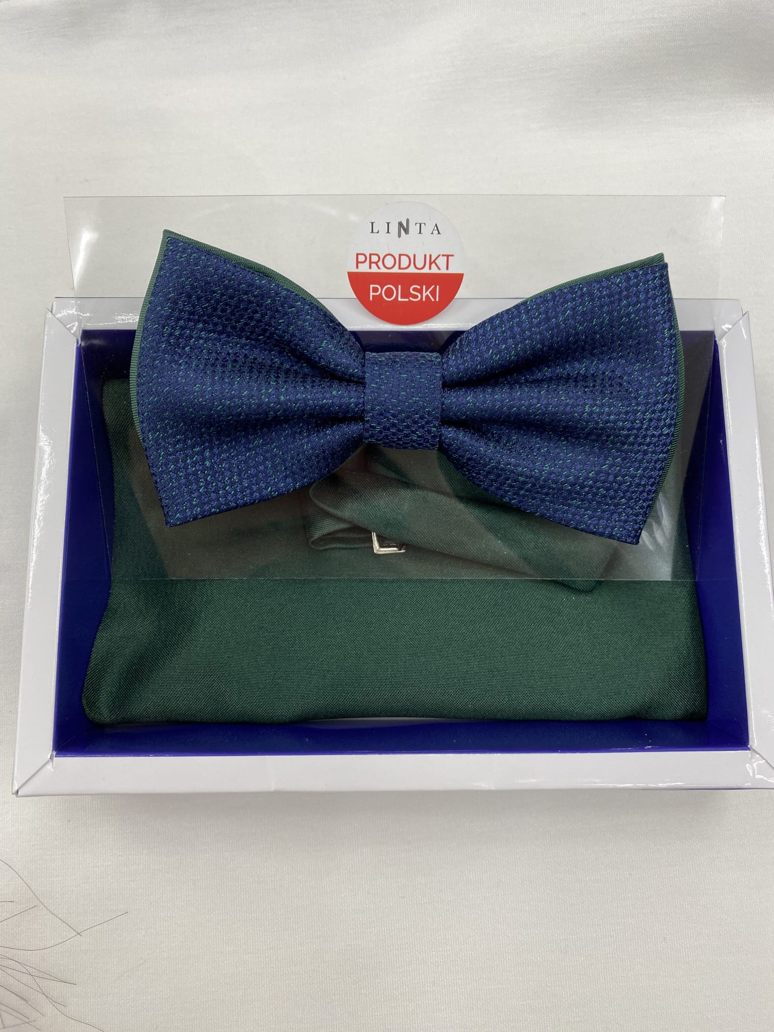 Mucha w zestawie z poszetką, zapakowana w pudełko.