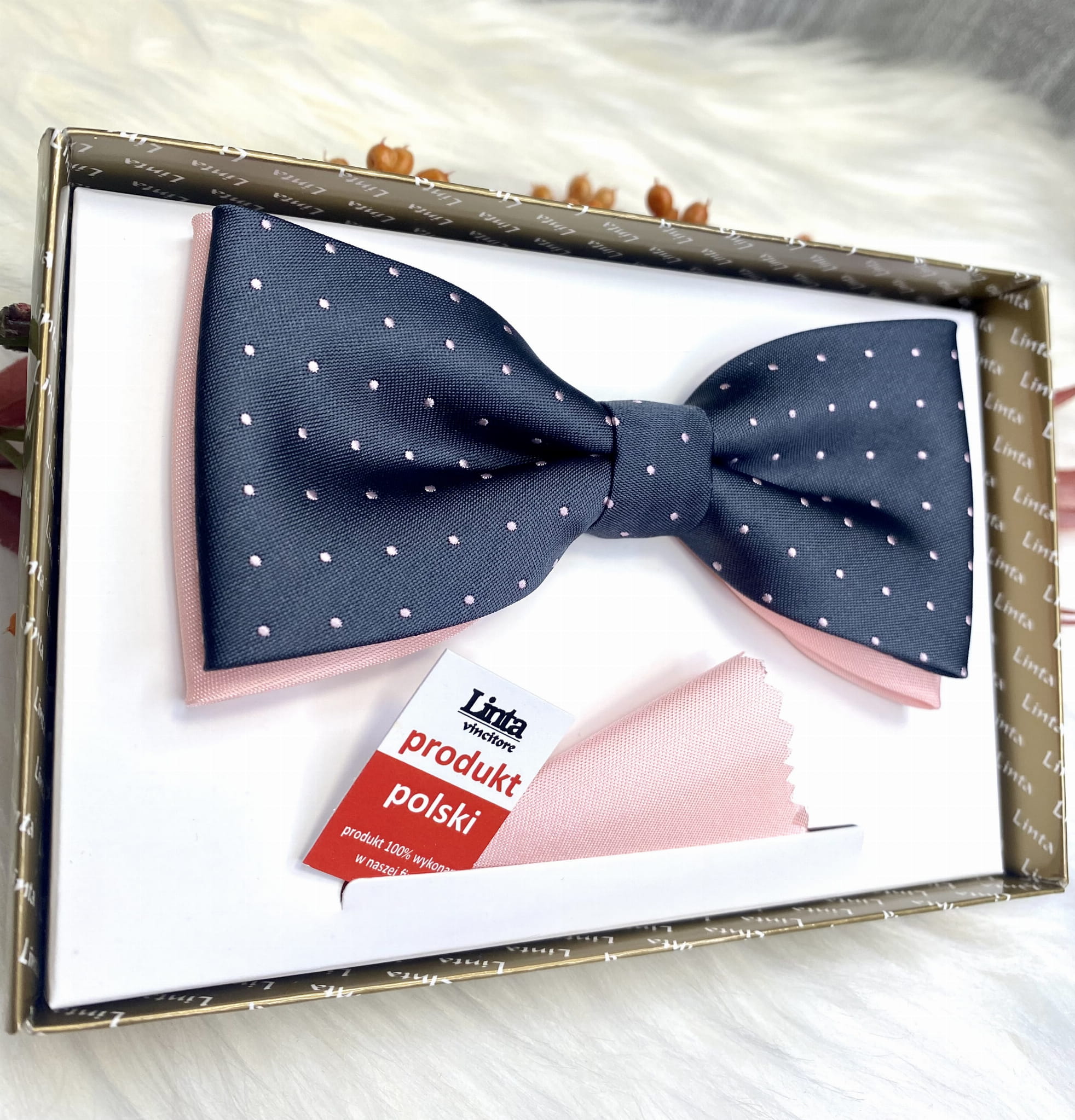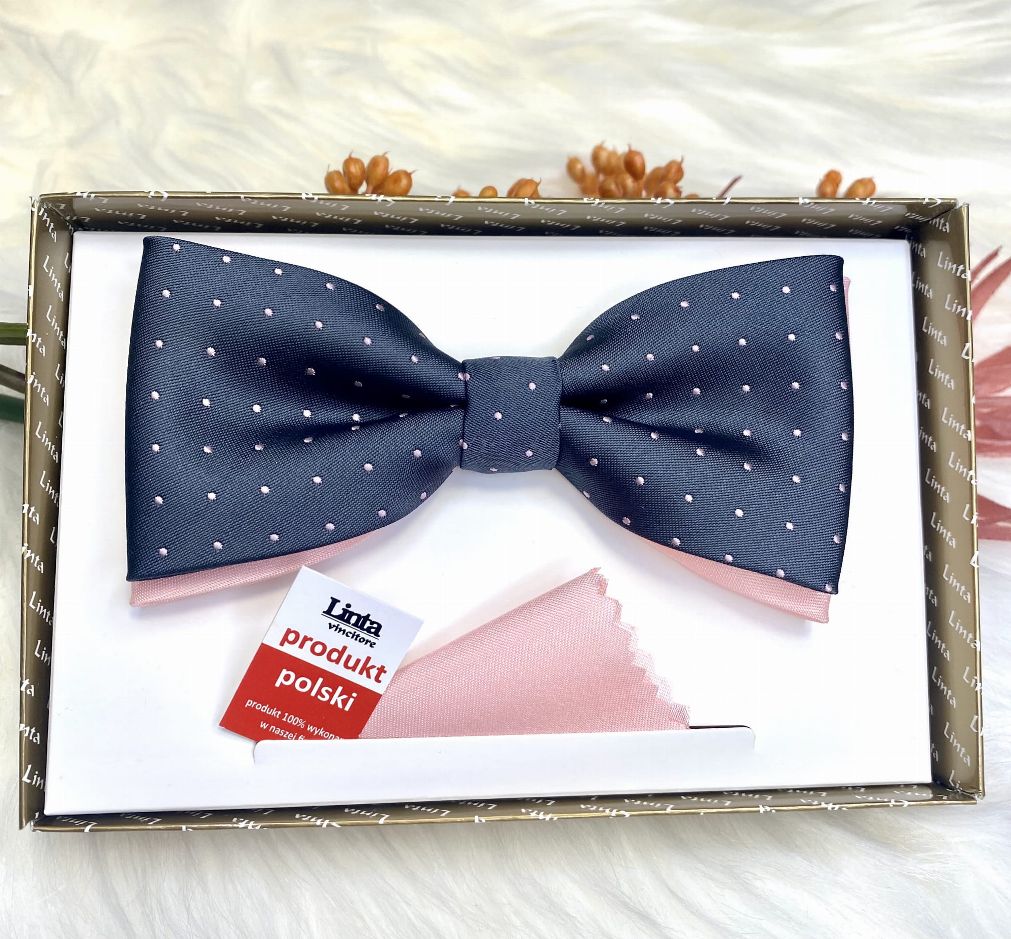 Mucha w zestawie z poszetką, zapakowana w pudełko.