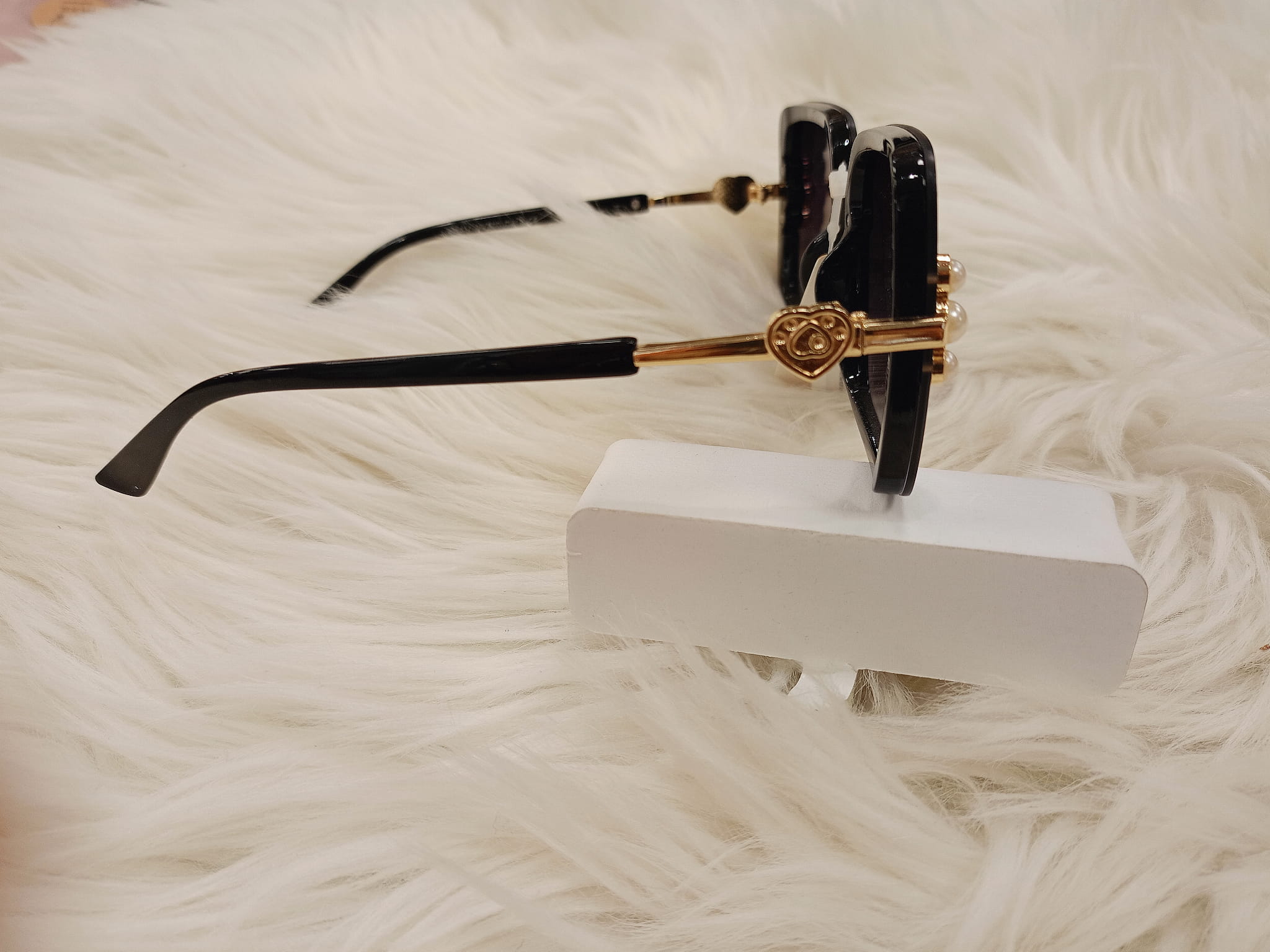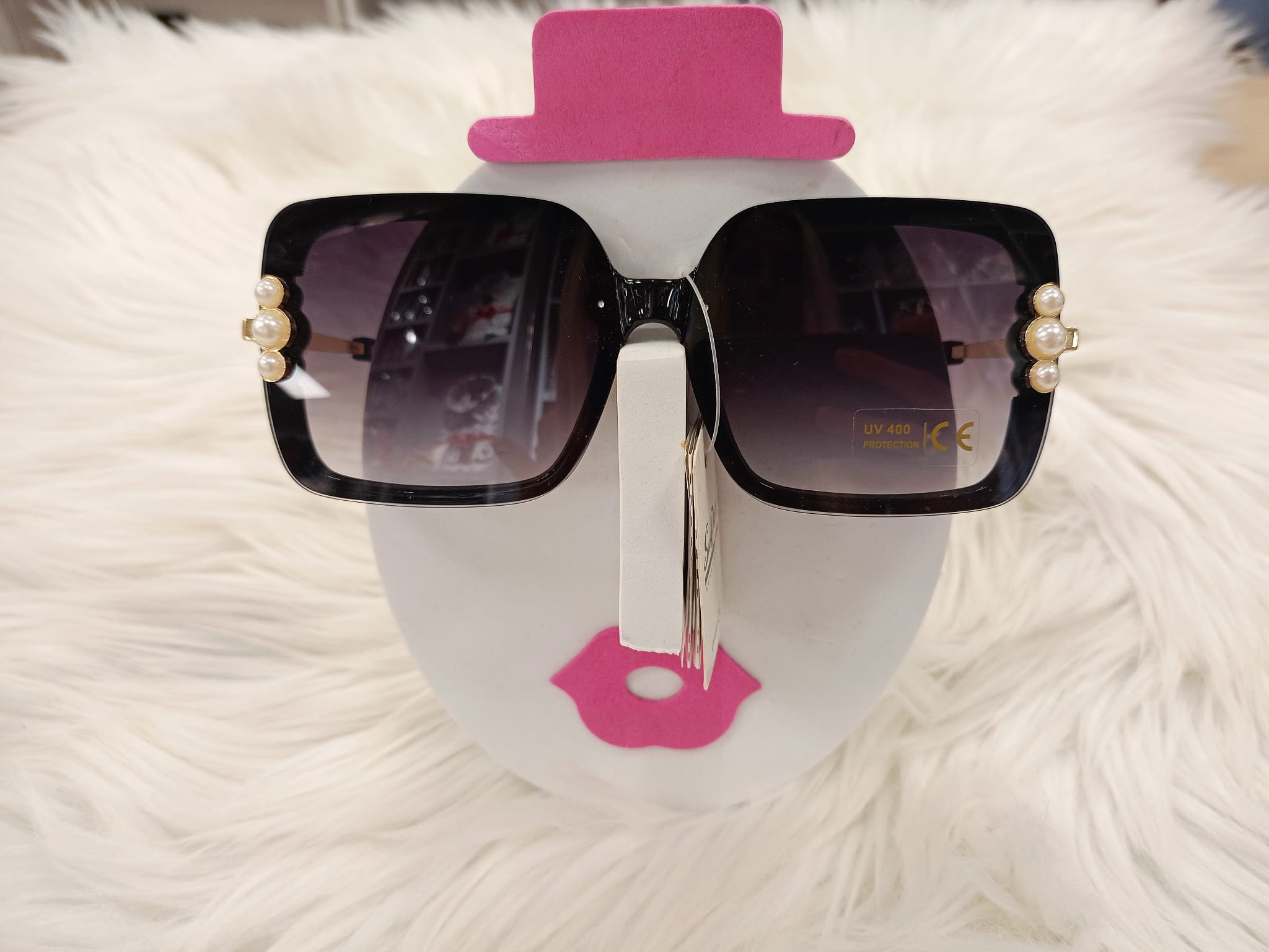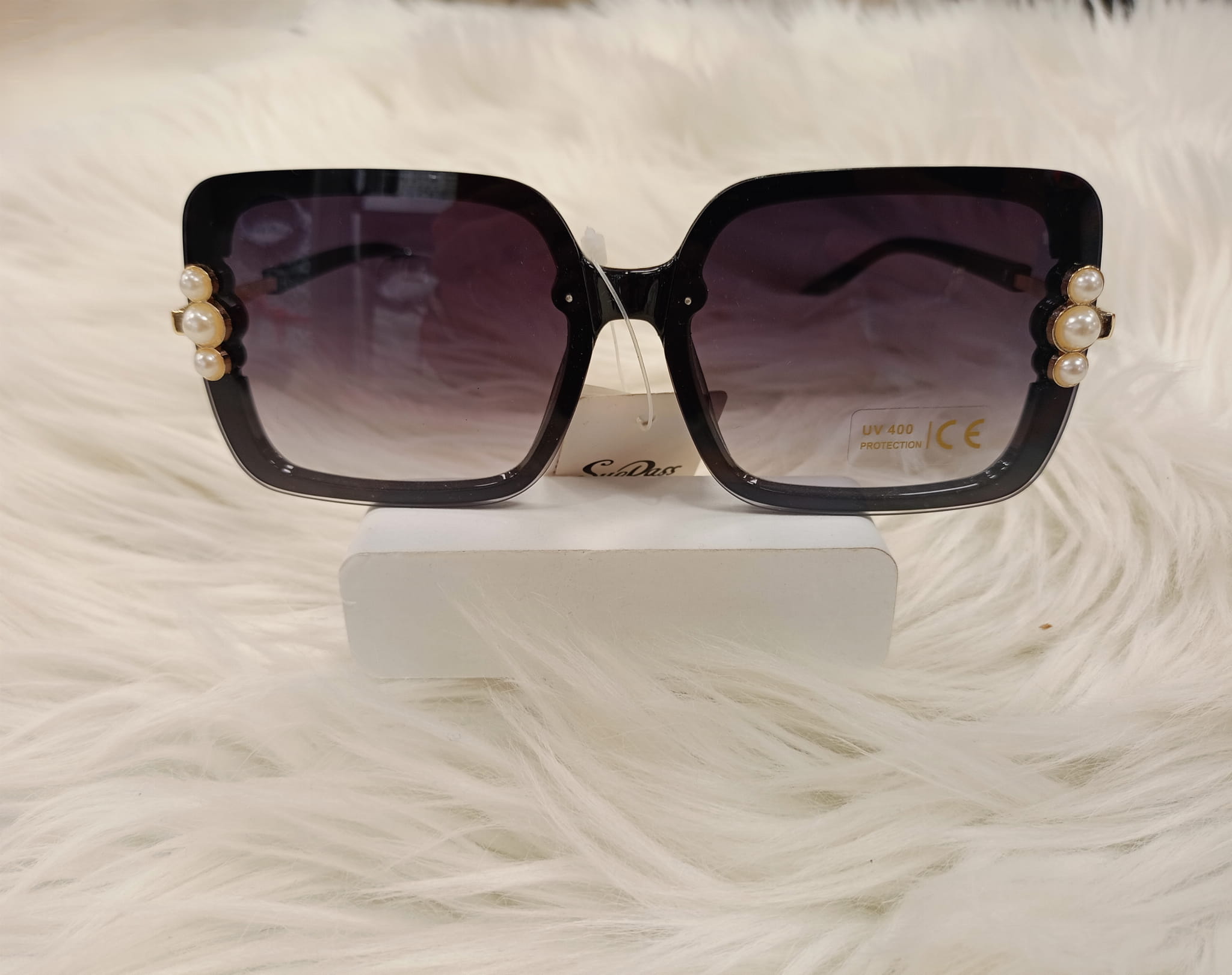 Okulary przeciwsłoneczne damskie o kształcie kwadratowym i ozdobnymi trzema perełkami.
