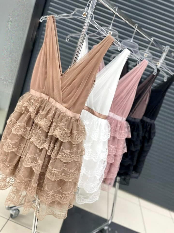 Sukienka LOLA pięć falbanek zakłądany dekolt ozobna tasiemka w pasie