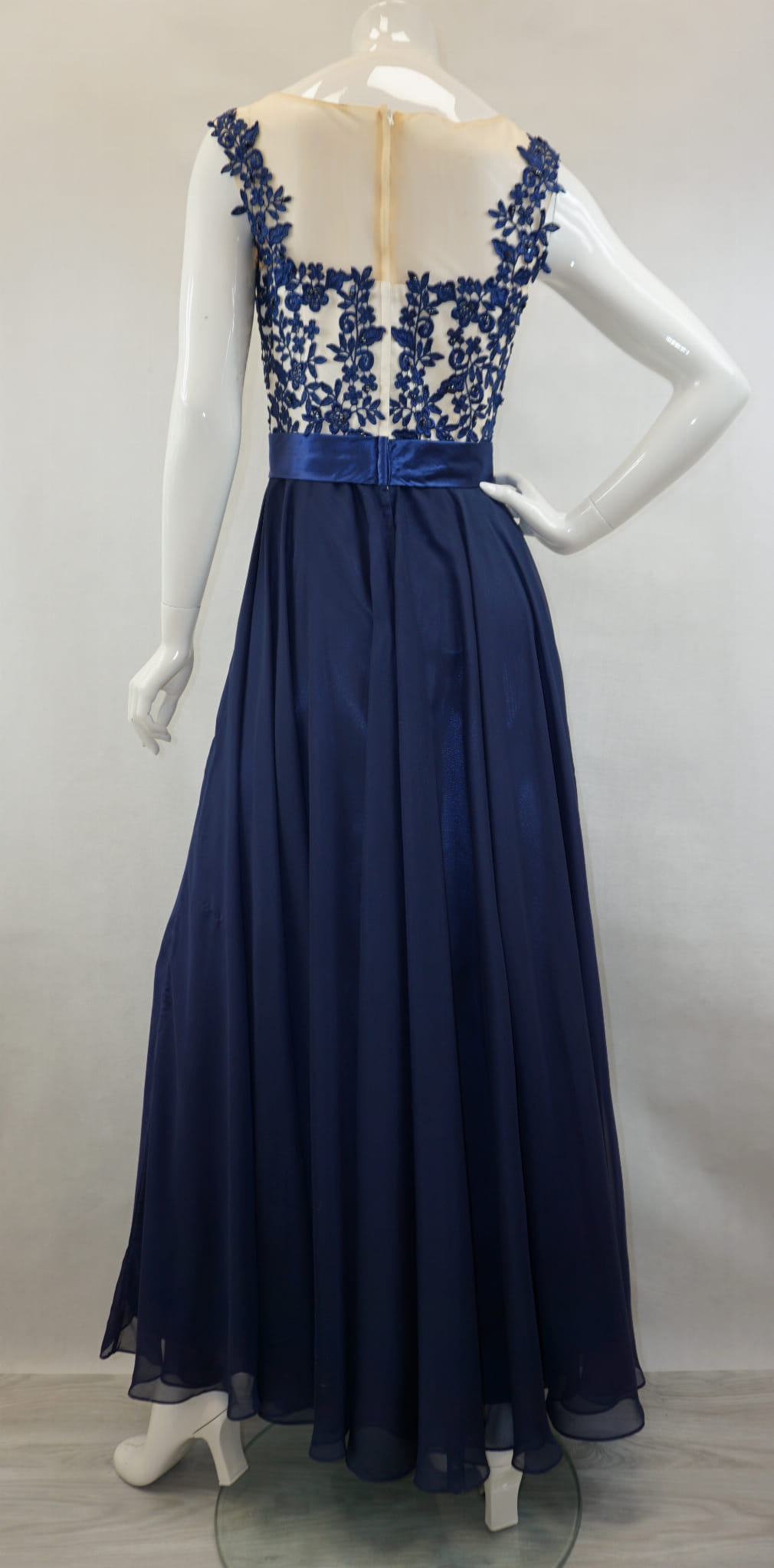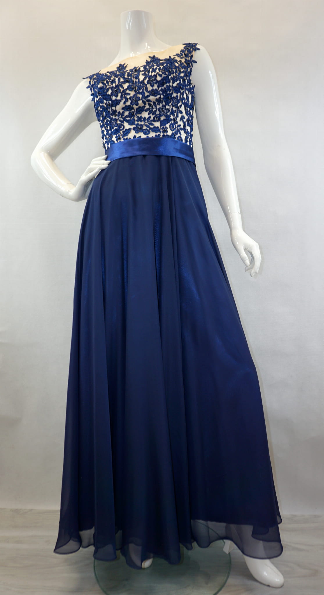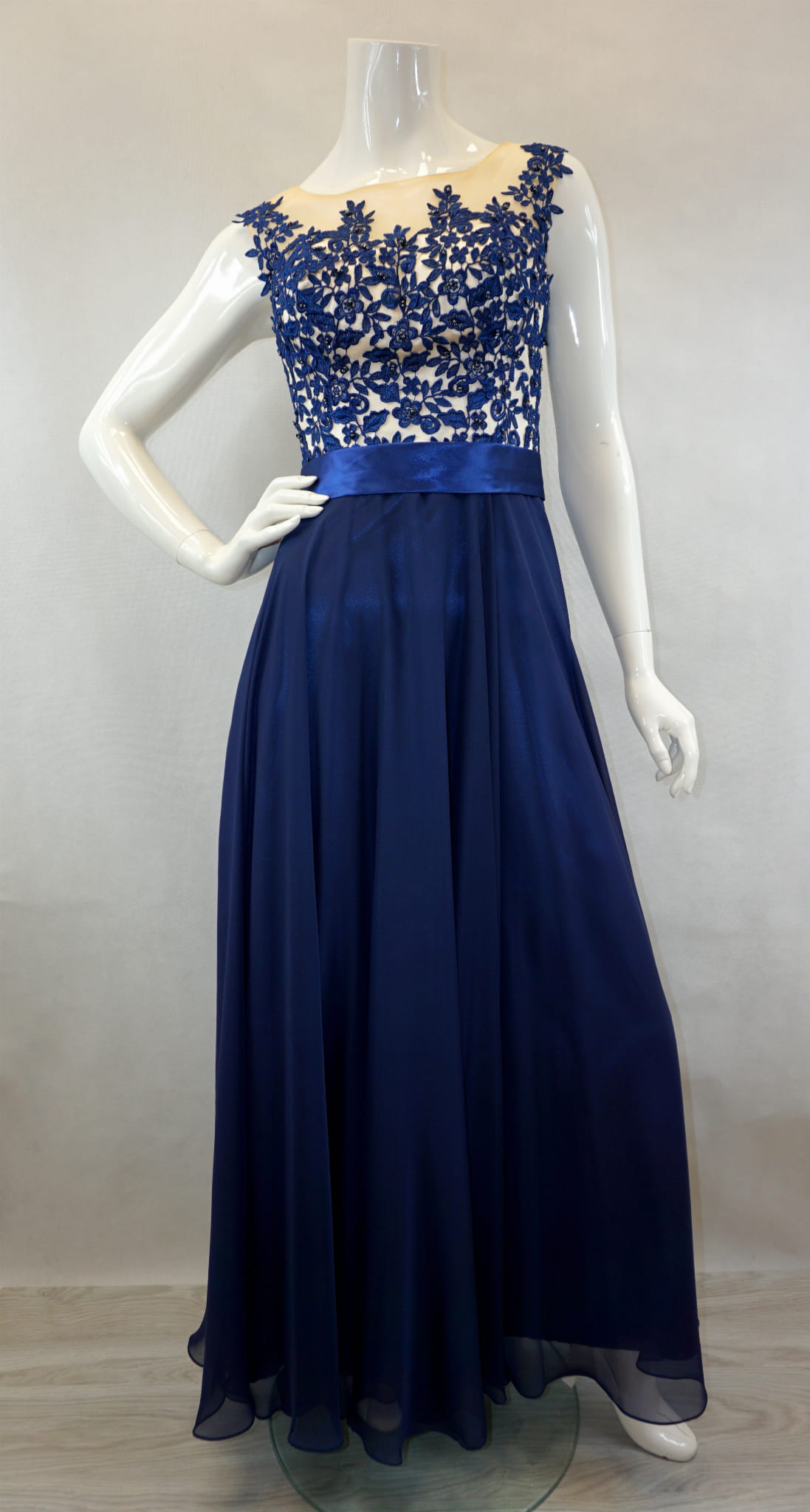 Atrakcyjna długa suknia wieczorowa w granatowym kolorze.