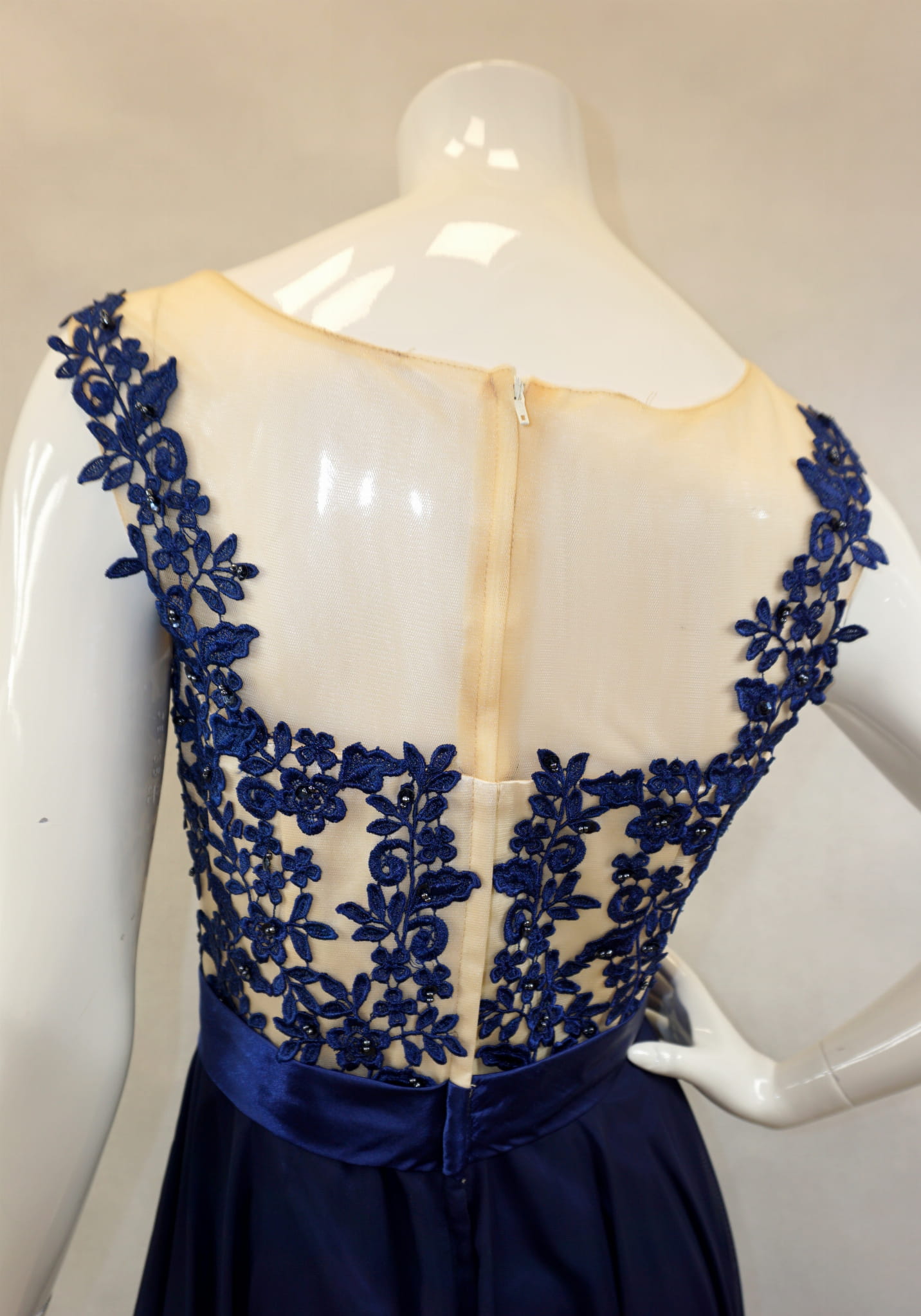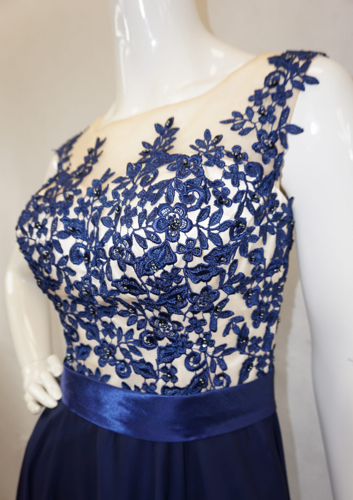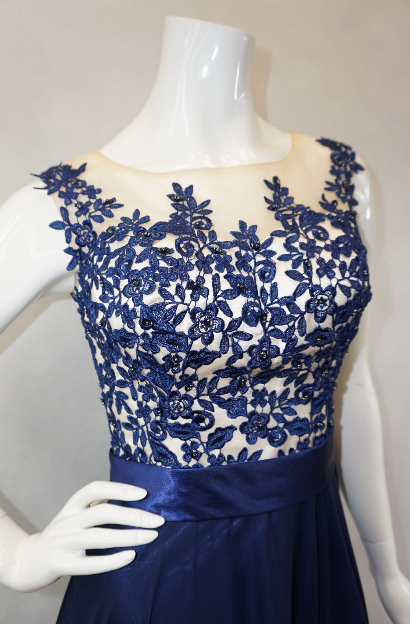 Atrakcyjna długa suknia wieczorowa w granatowym kolorze.