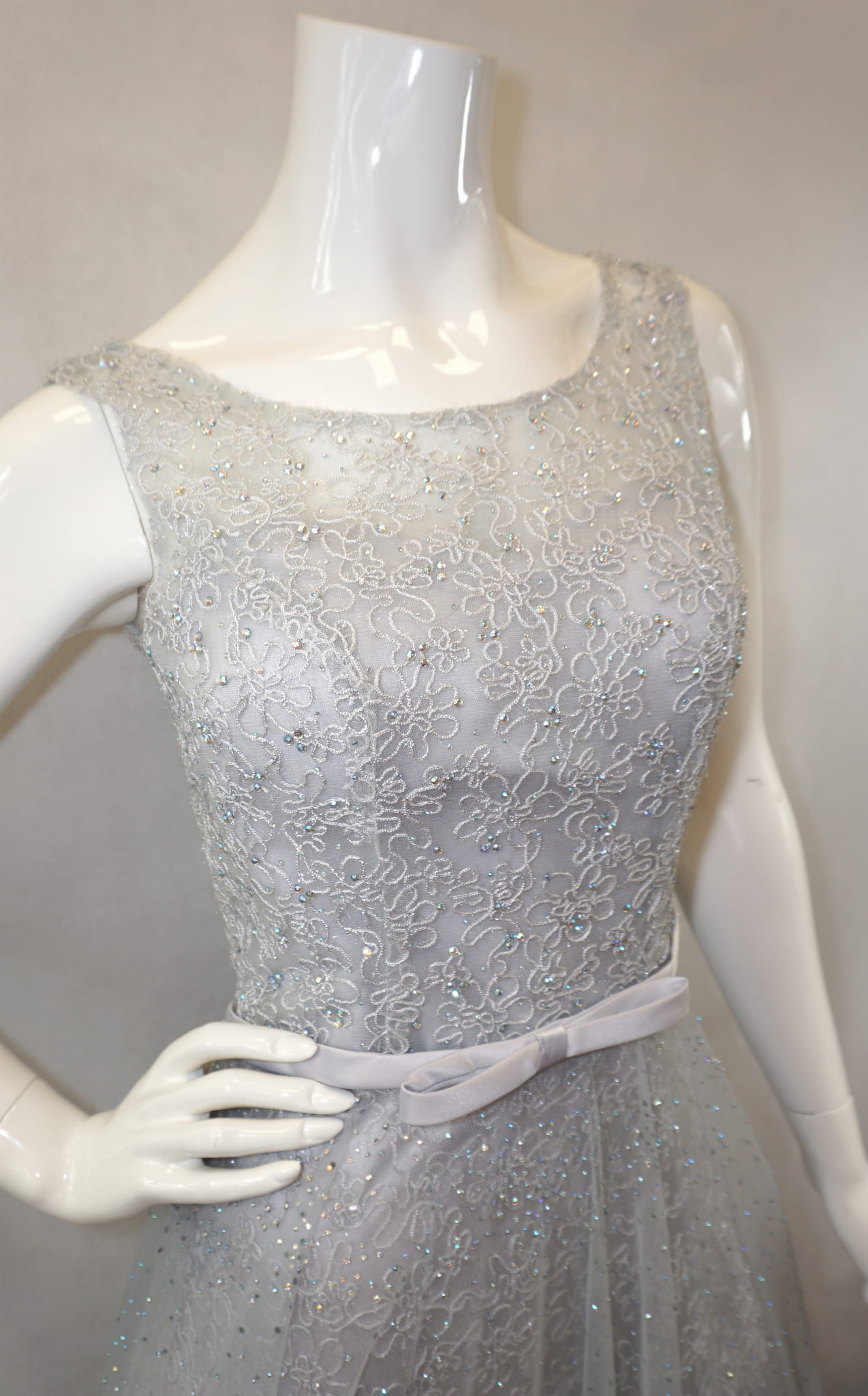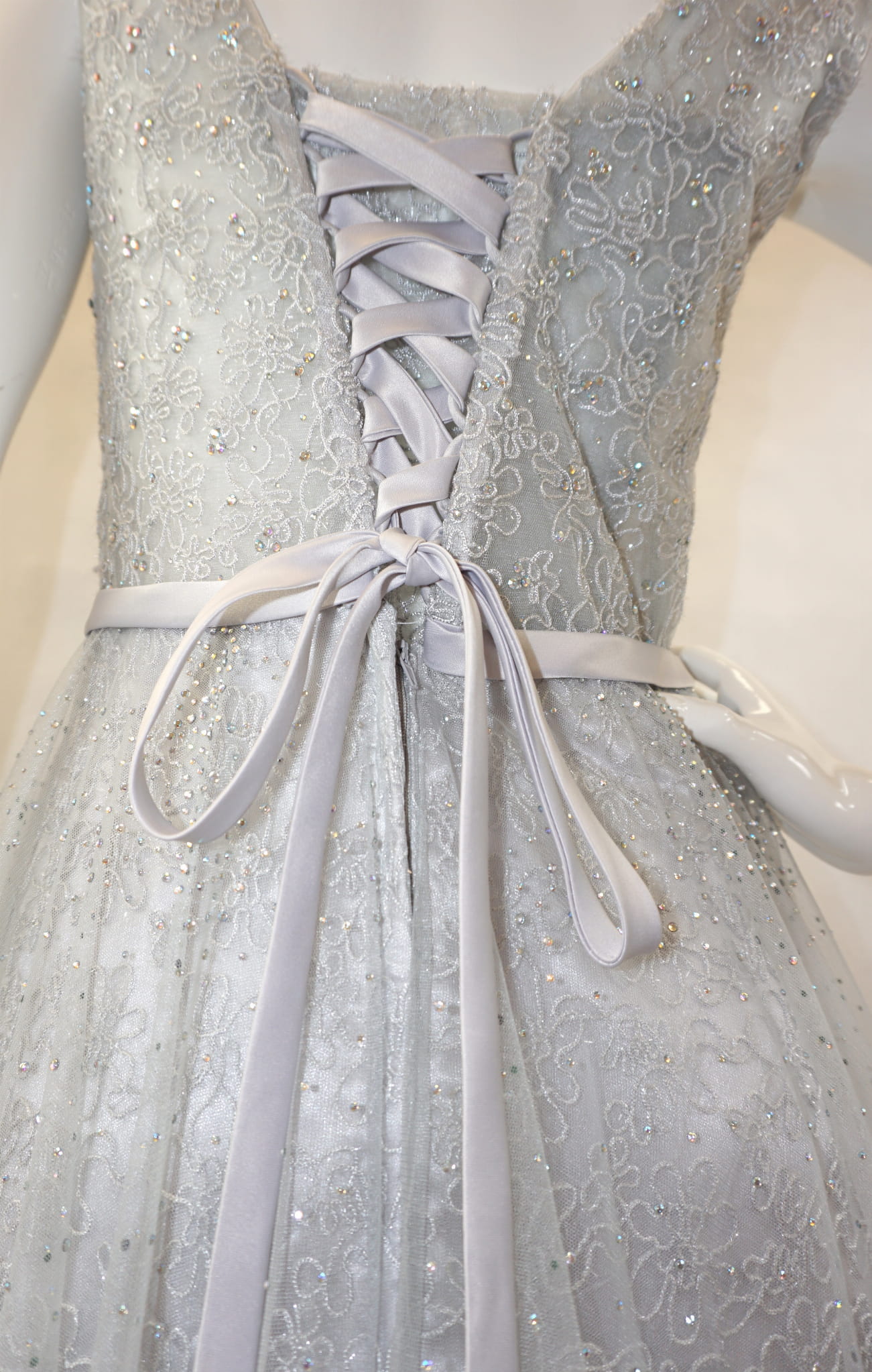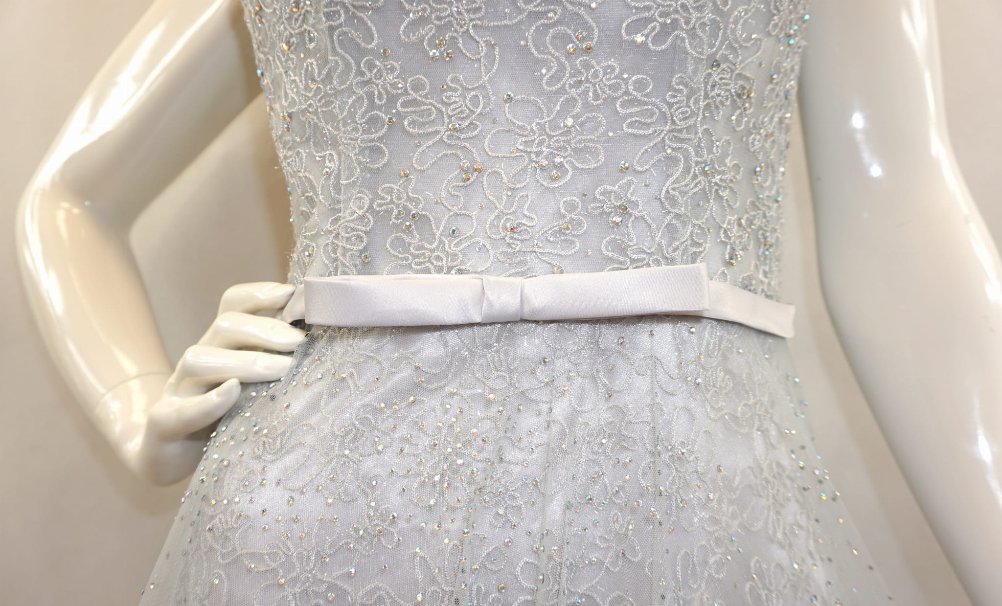 Olśniewająca suknia balowa z siateczkową górą obszytą gipiurową koronką ozdobioną cyrkonią.