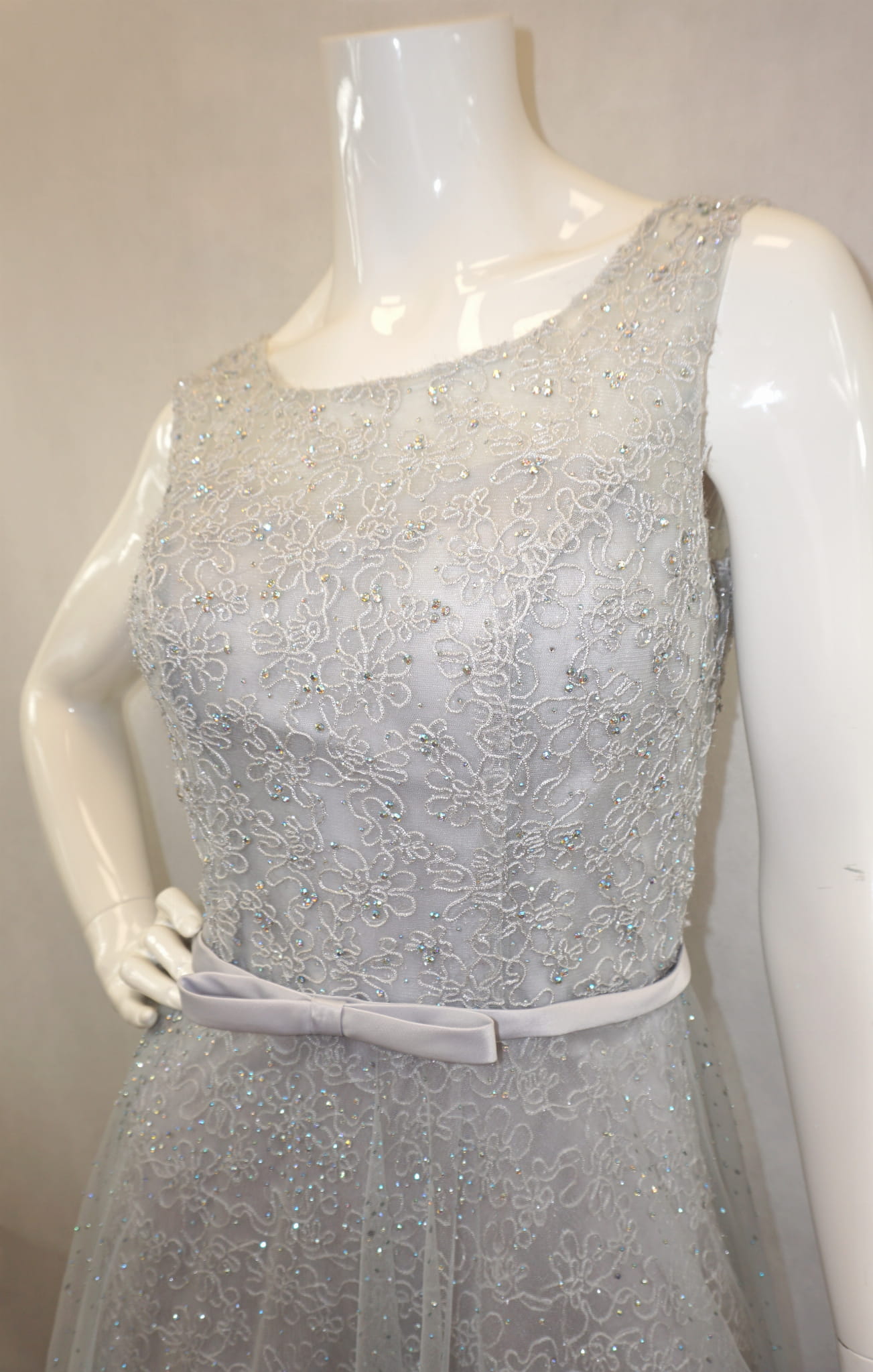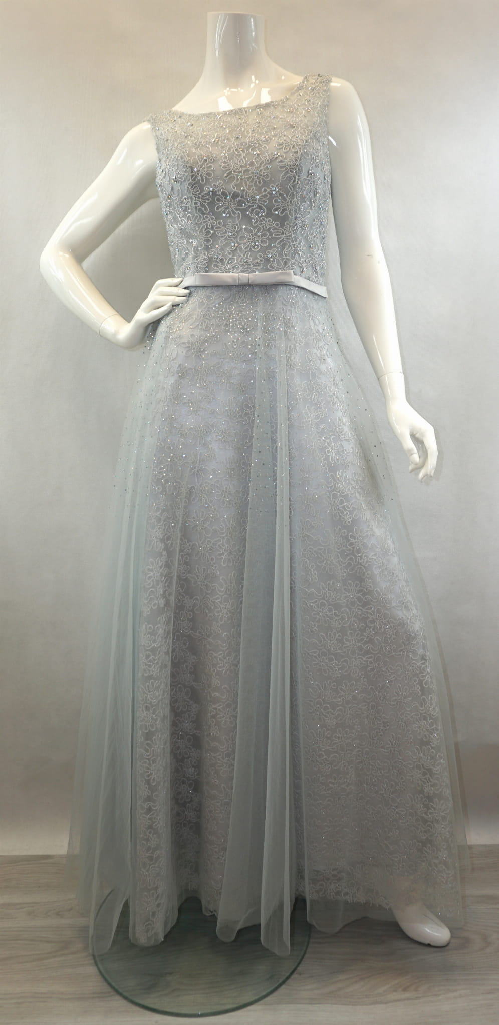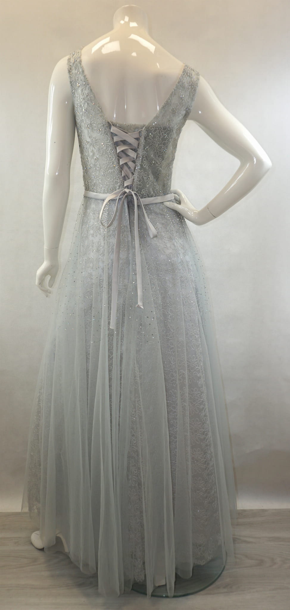 Olśniewająca suknia balowa z siateczkową górą obszytą gipiurową koronką ozdobioną cyrkonią.