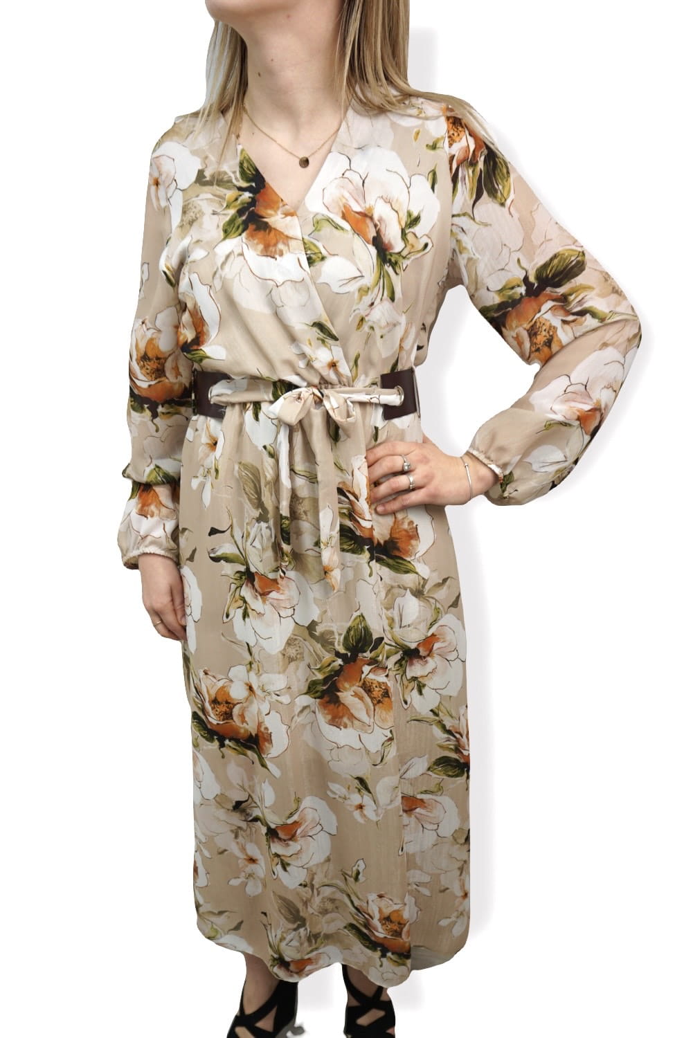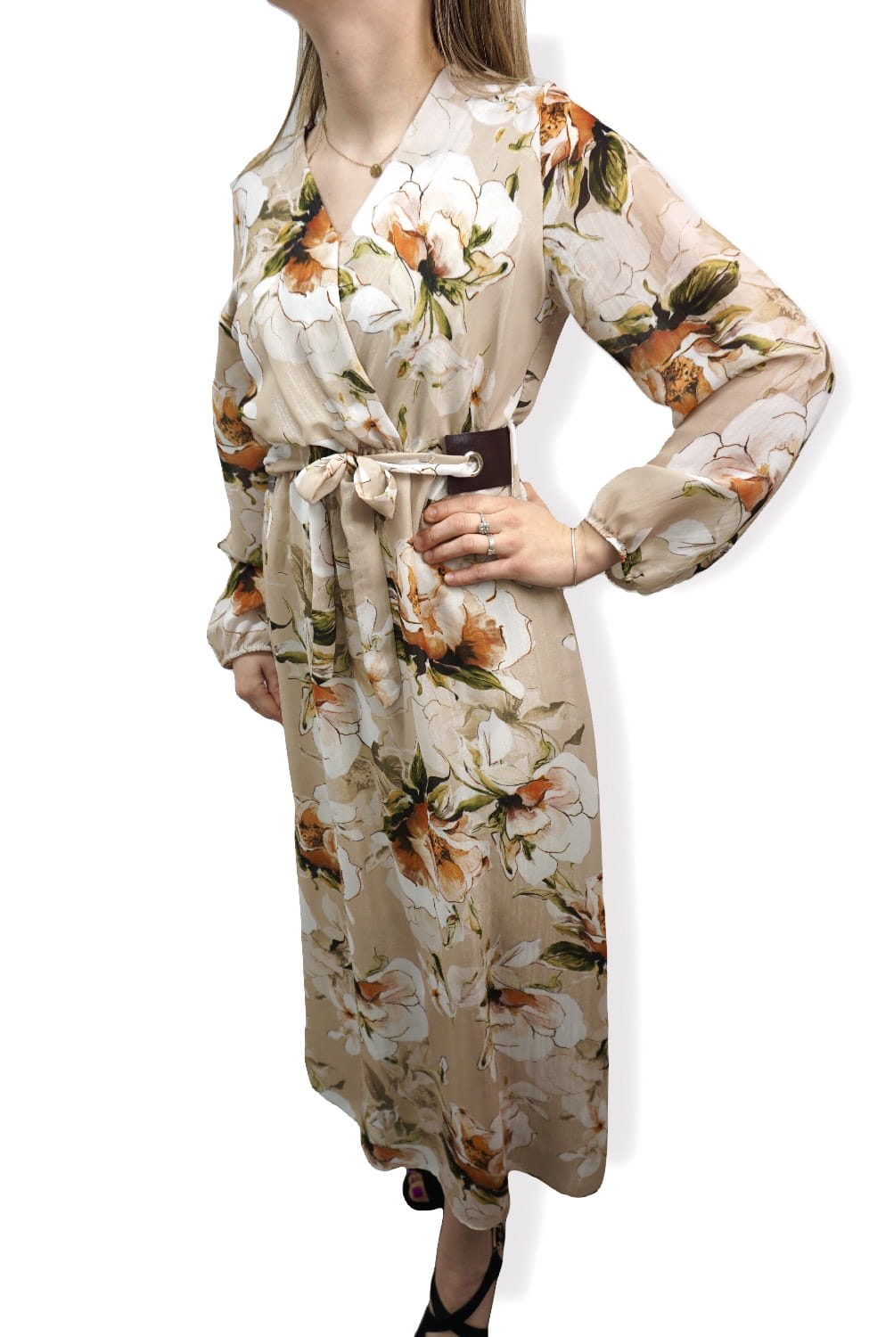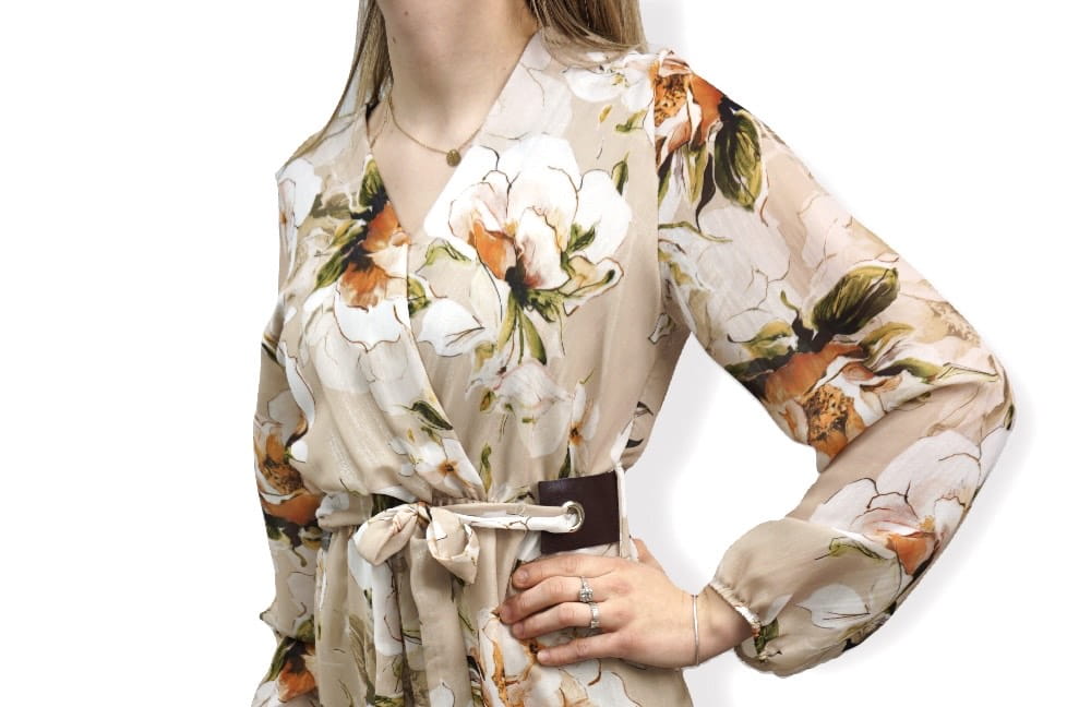 Sukienka we wzór kwiatów z ozdobnym paskiem.