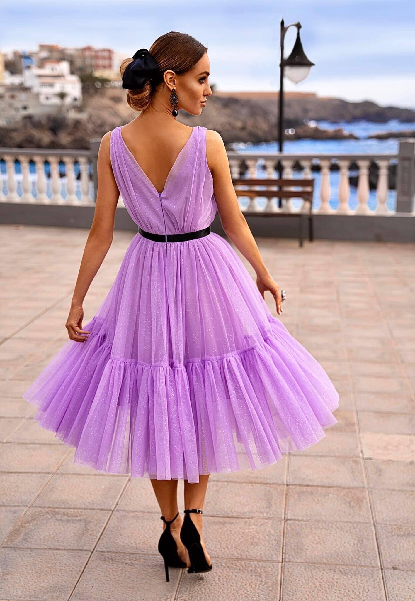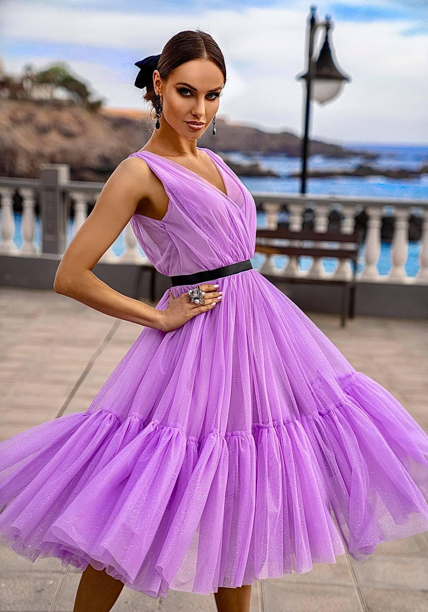 Elegancka sukienka z tiulu obsypana brokatem.
