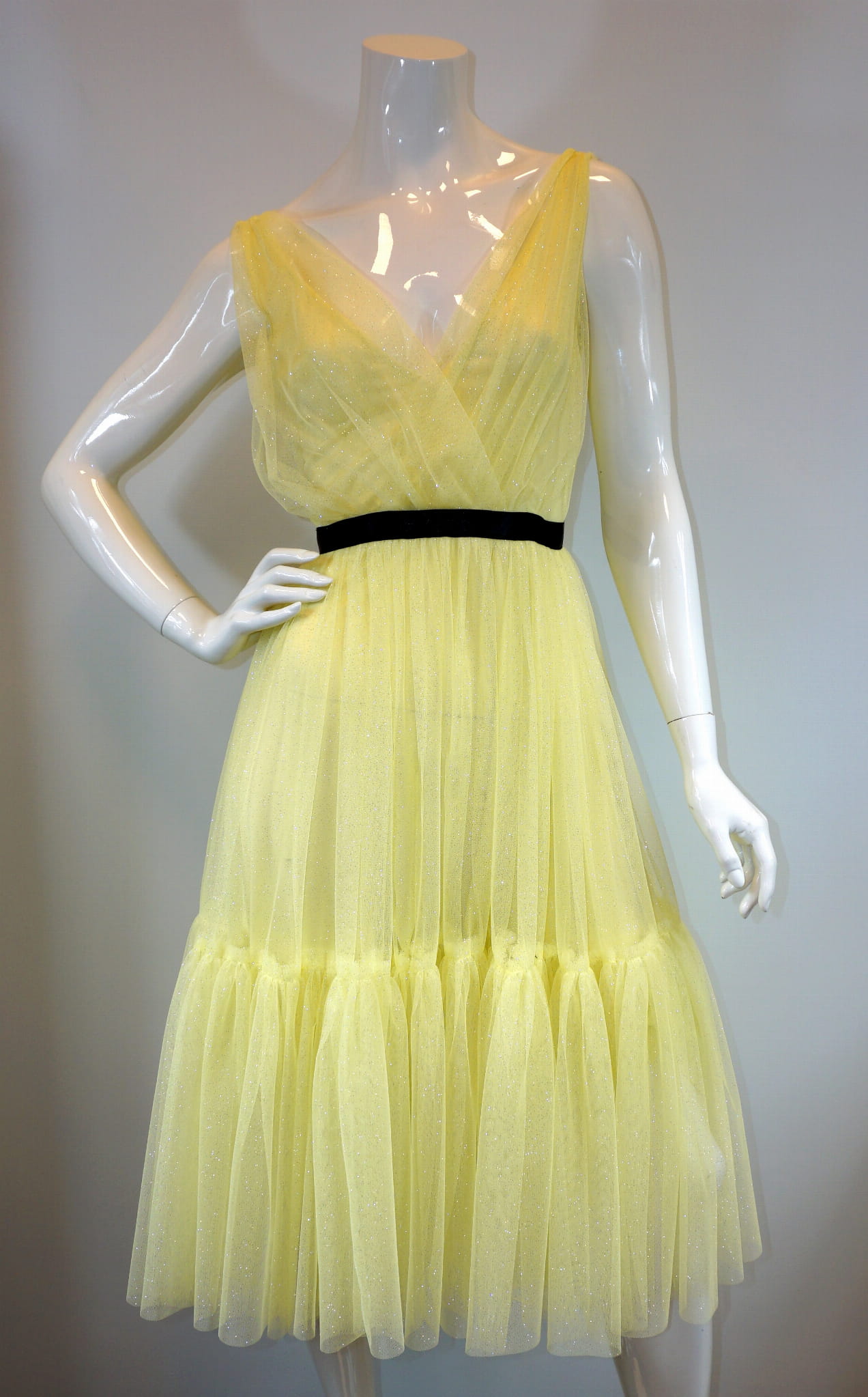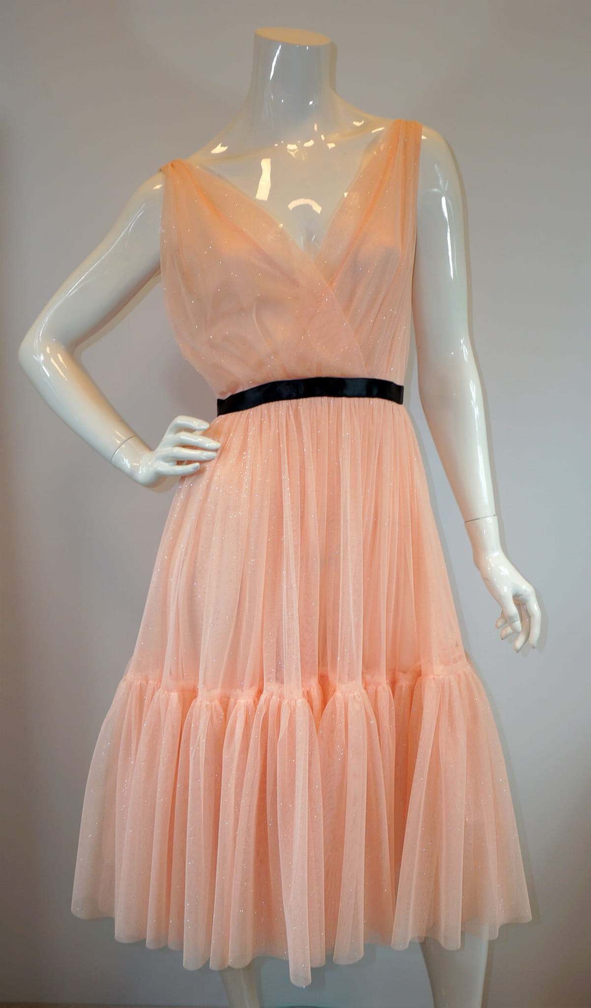 Dekolt i plecy wycięte w V, w pasie zaznaczone odcięcie czarną tasiemką.
