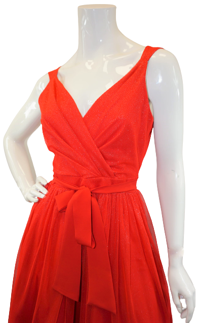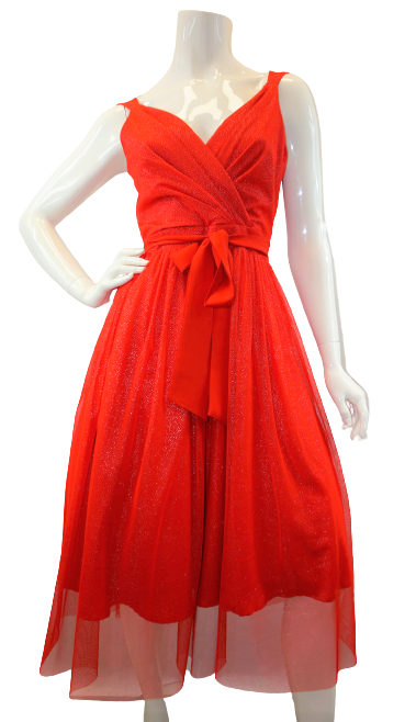 Tiulowa sukienka z delikatną brokatową poświatą o długości midi.