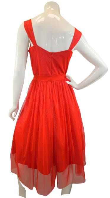 Dół sukienki rozkloszowany, warstwa tiulu dłuższa od podszewki.