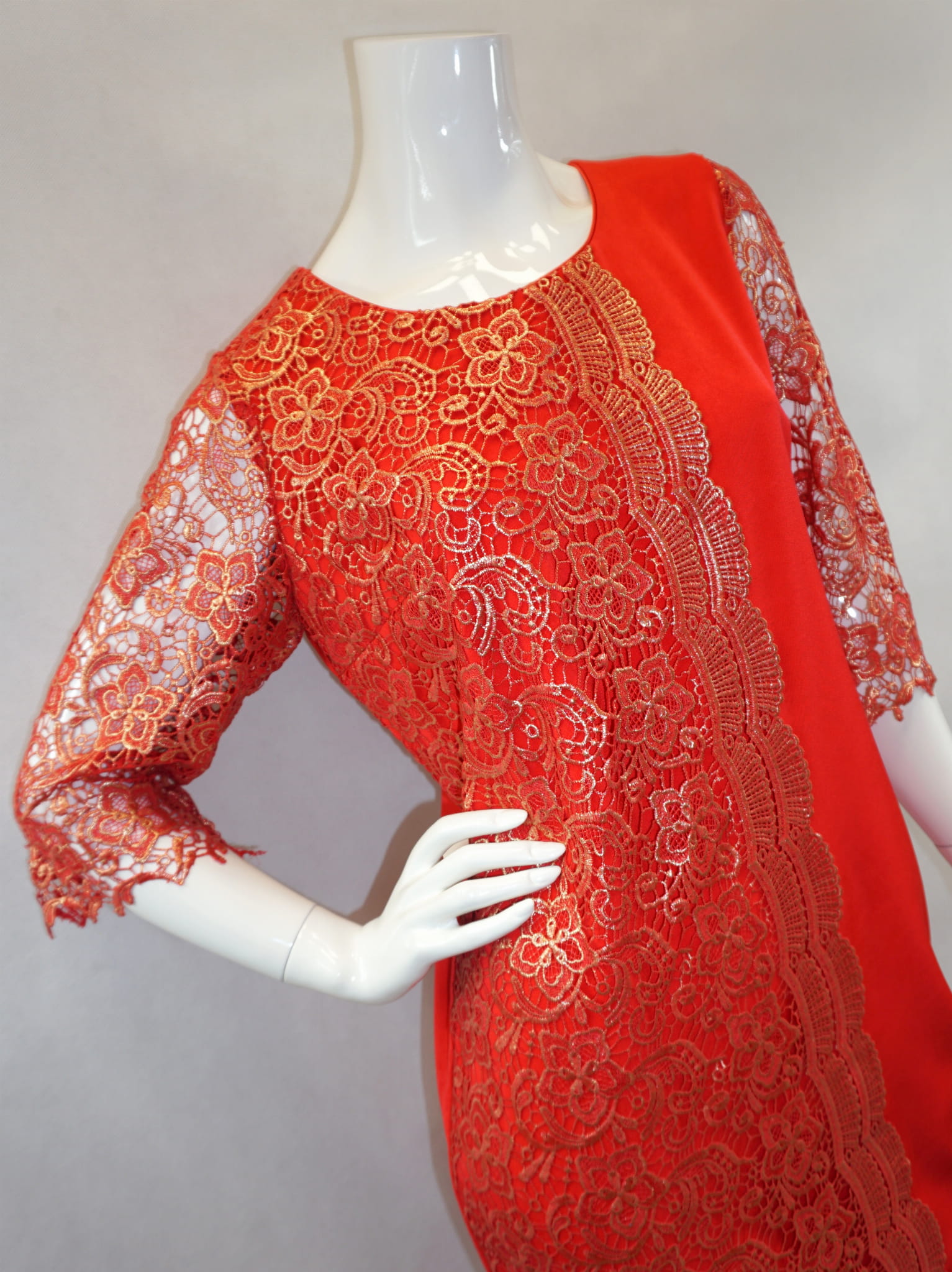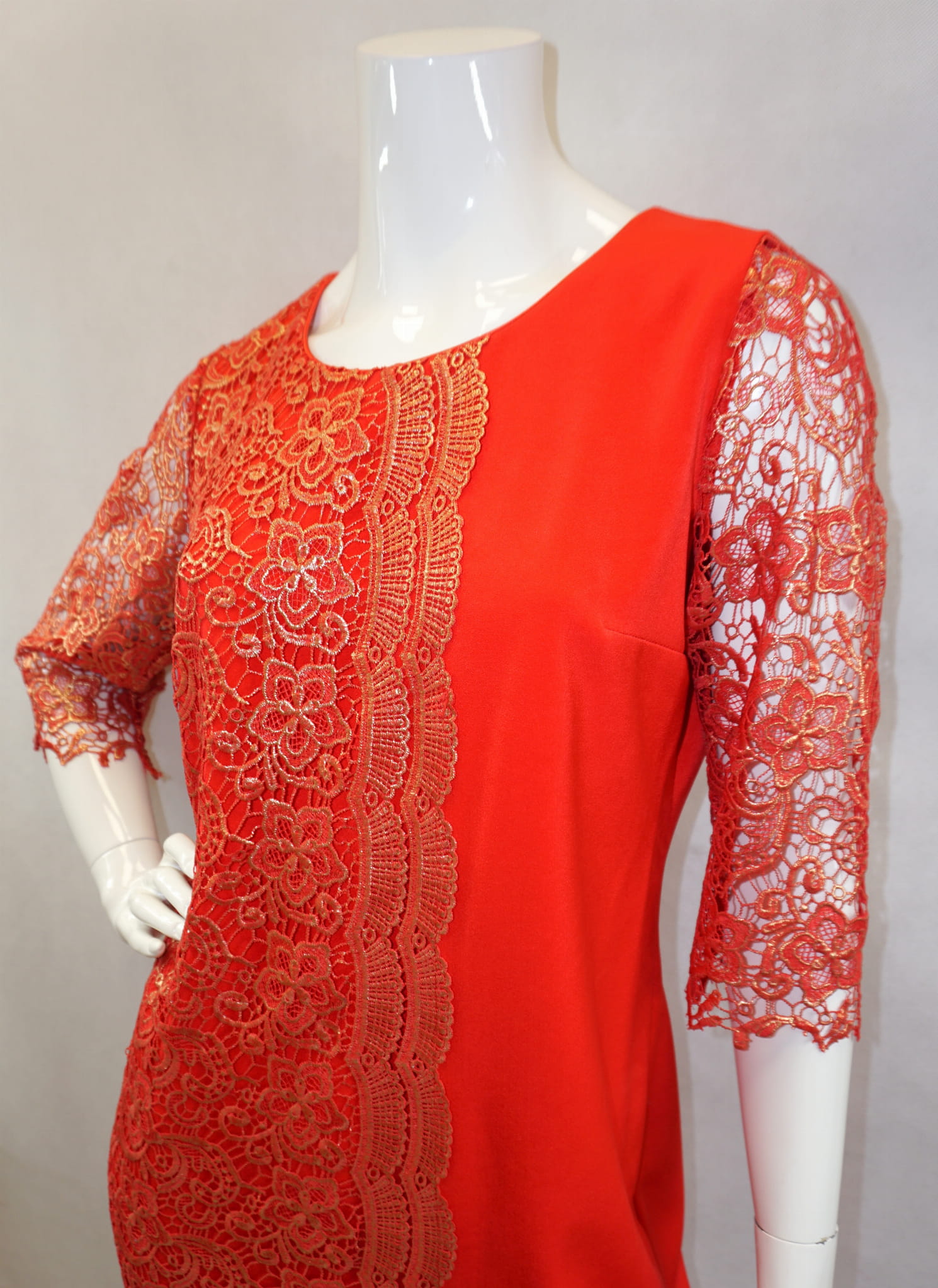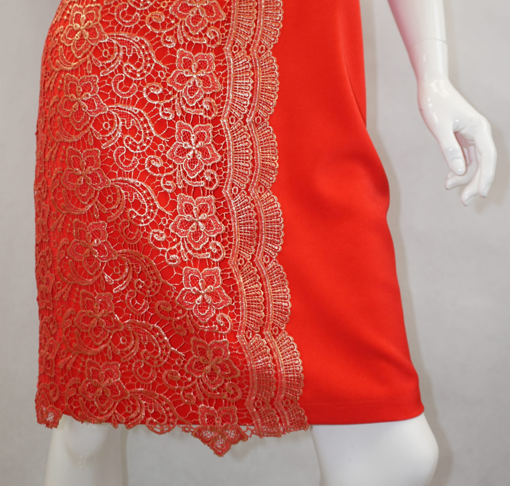 Elegancka czerwona sukienka zdobiona pozłacaną koronką.