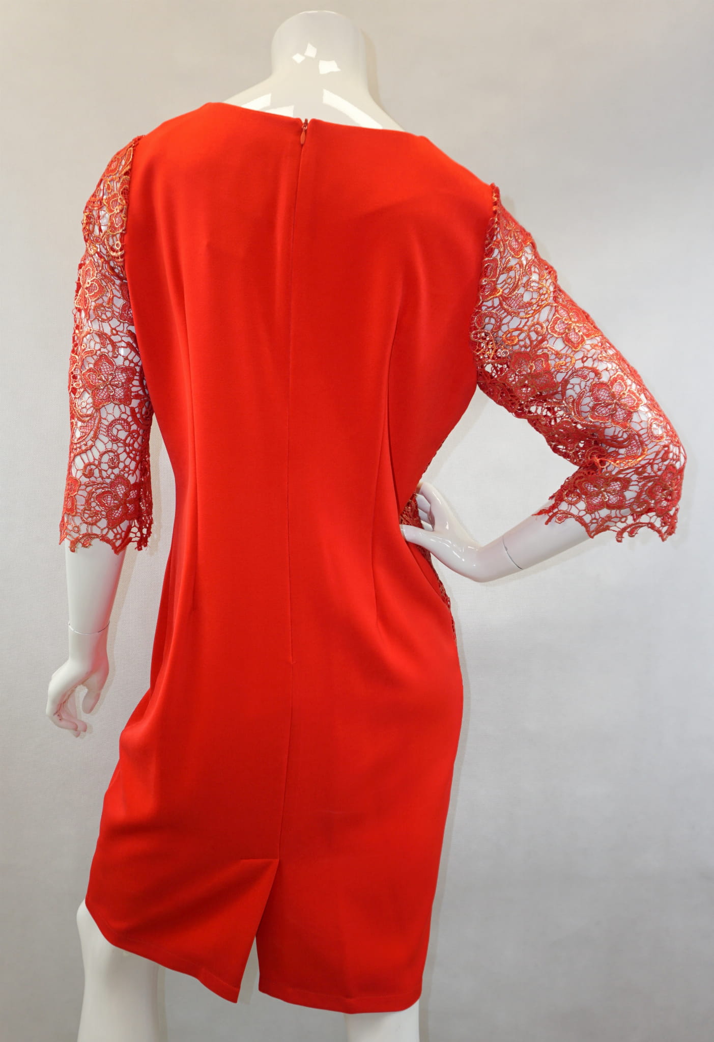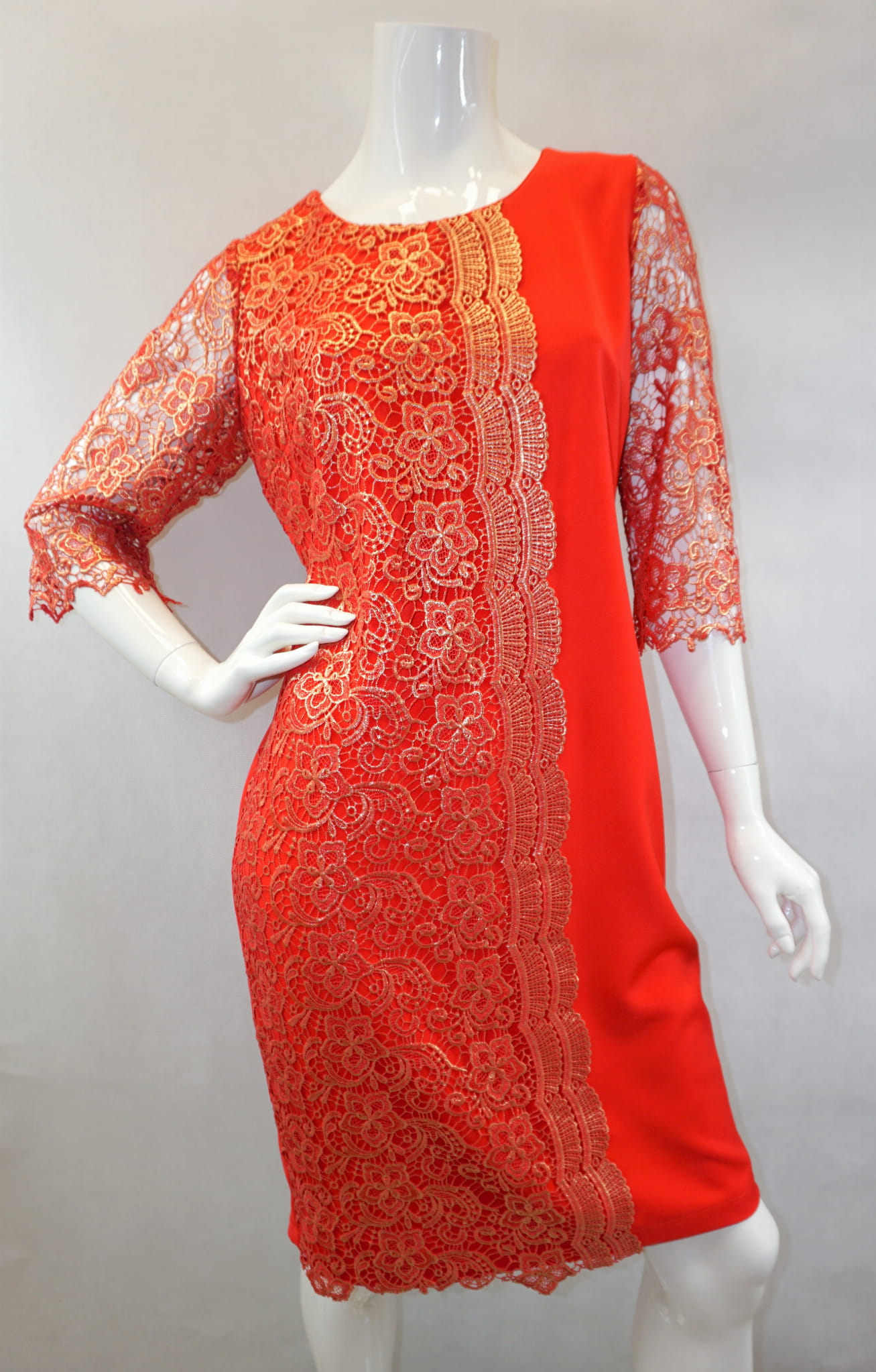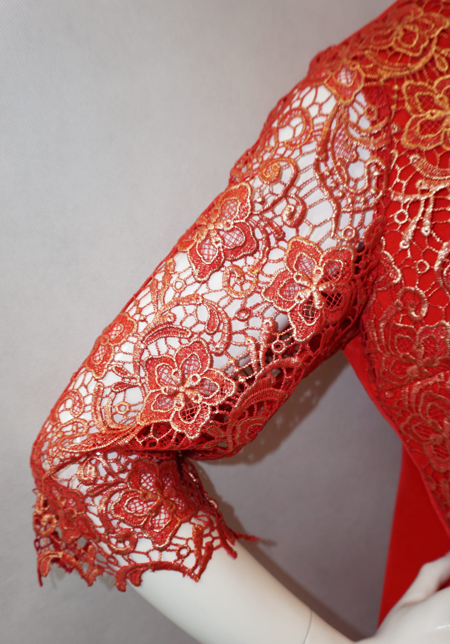 Elegancka czerwona sukienka zdobiona pozłacaną koronką.
