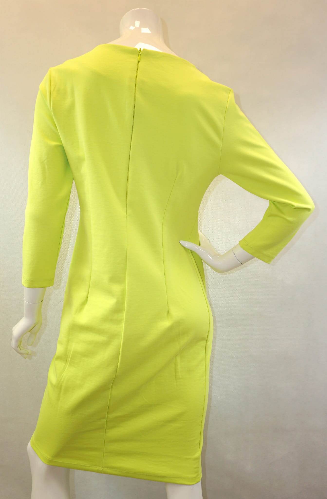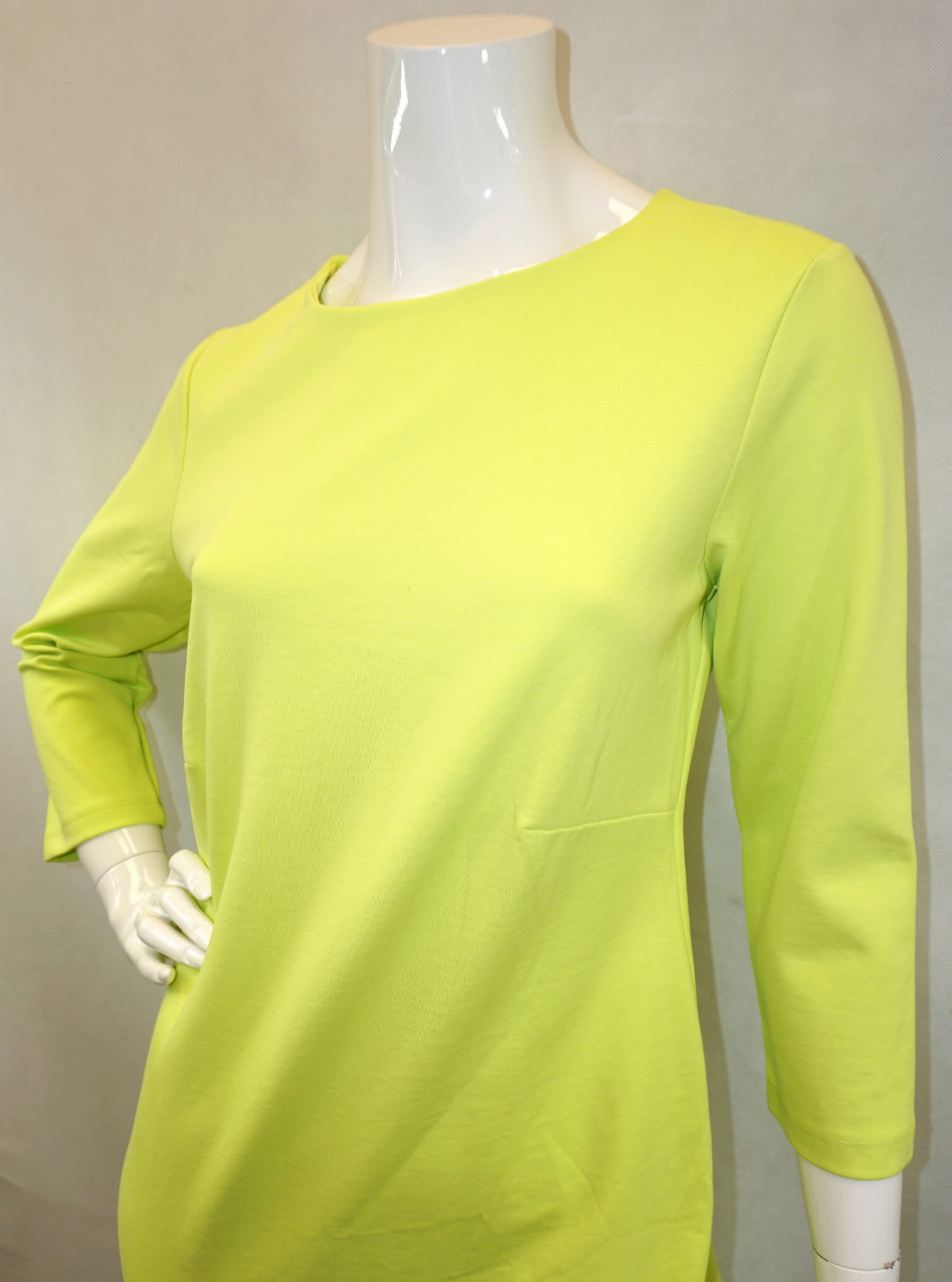 Fason z okrągłym dekoltem i rękawem 3/4 zakończonym ozdobnym rozcięciem.