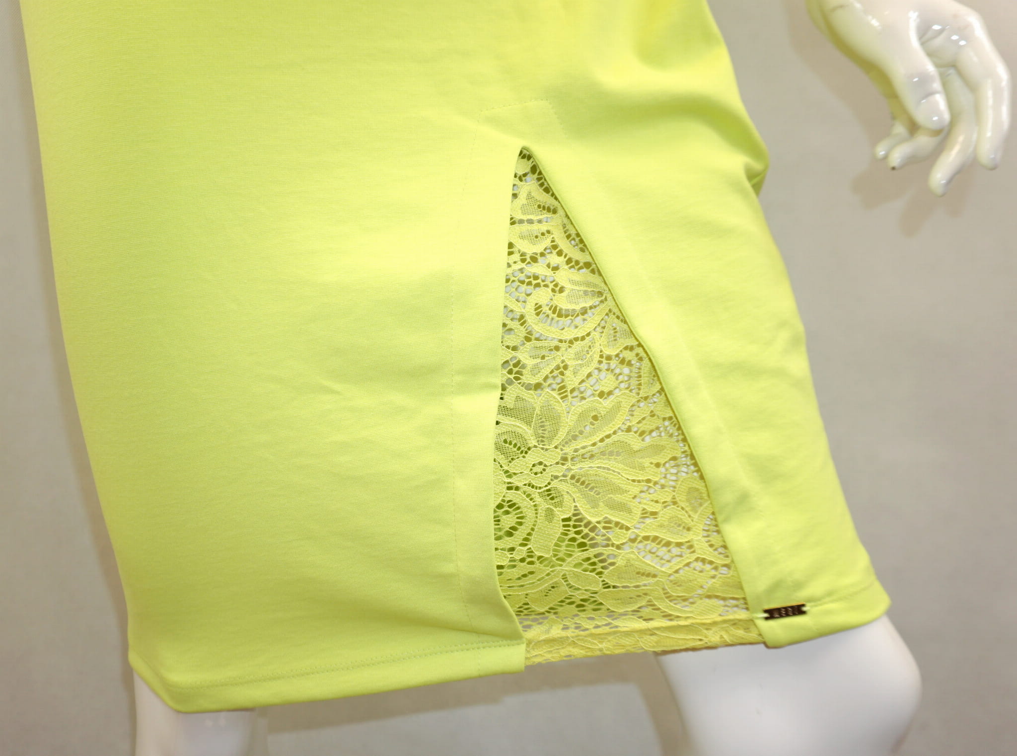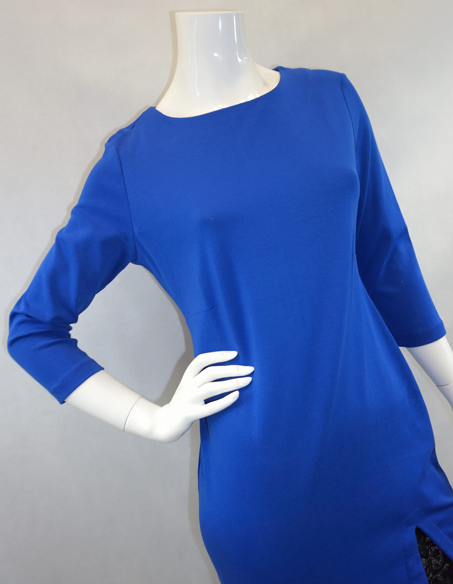 Sukienka dopasowana z koronkowym rozcięciem u dołu.