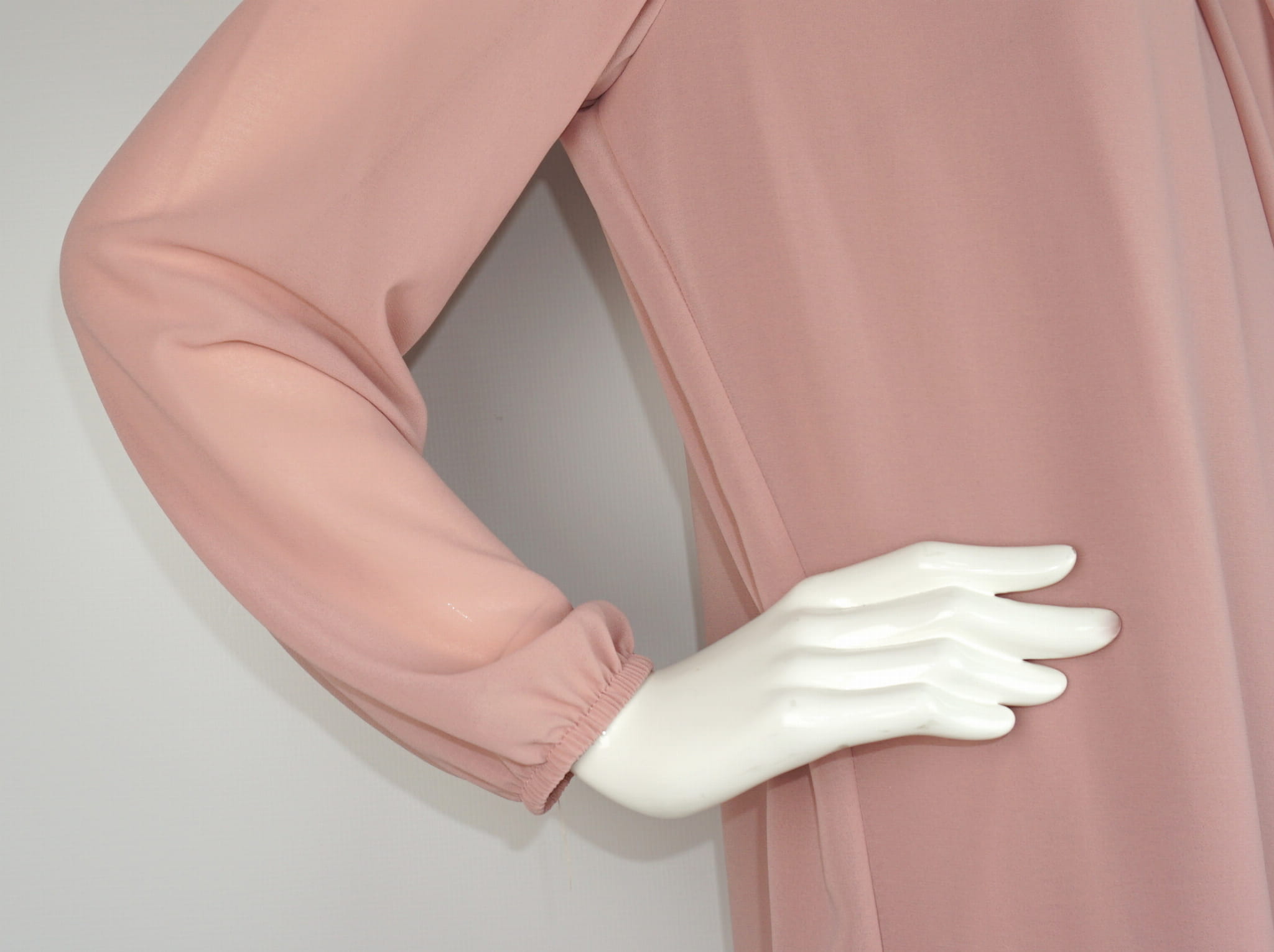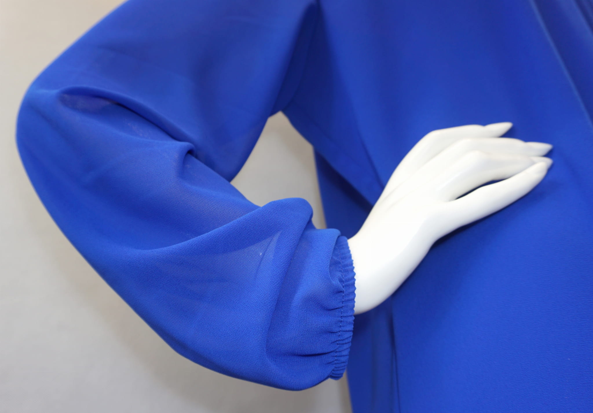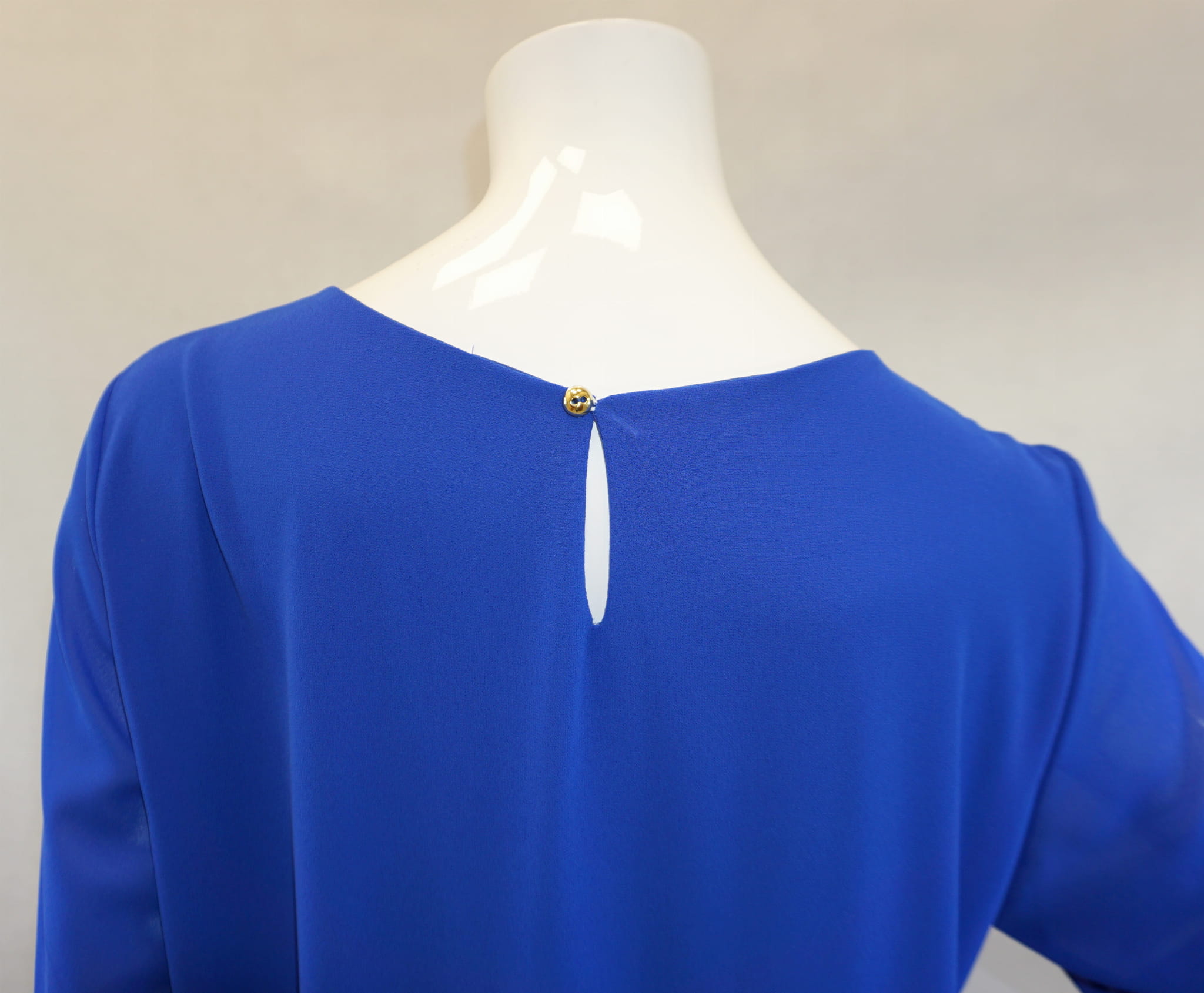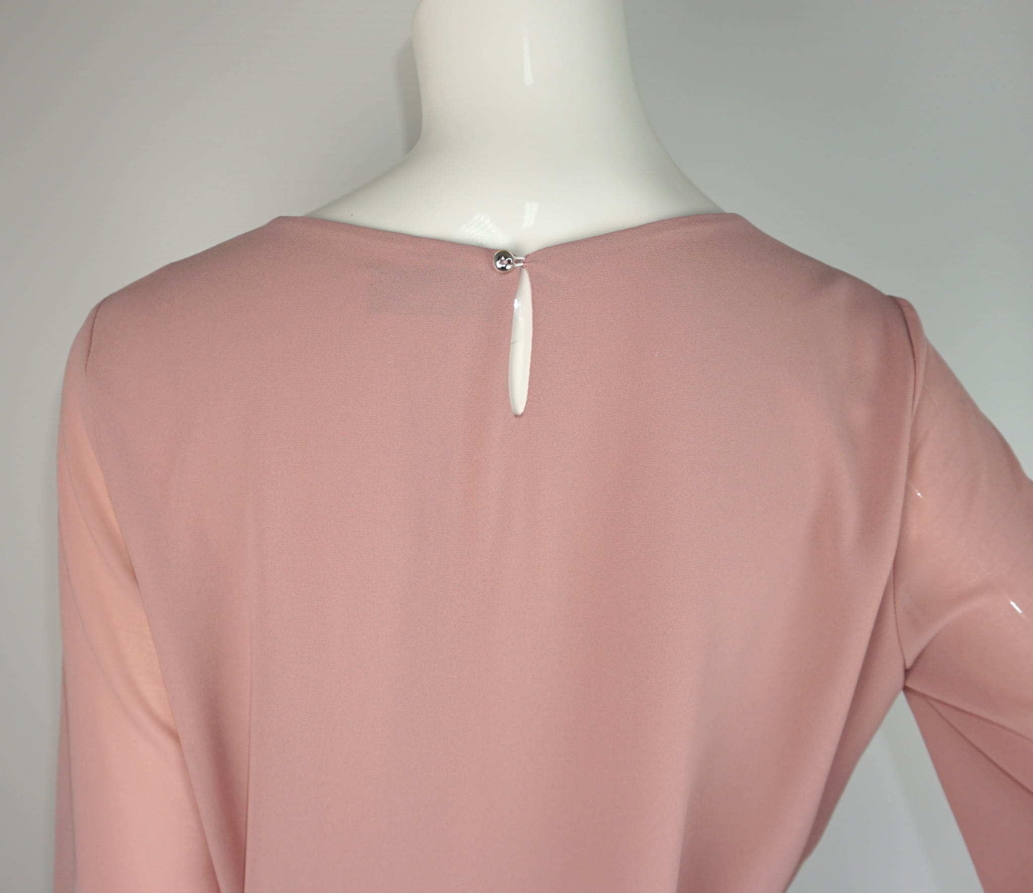 Model posiada okrągły dekolt z delikatnym marszczeniem, zapinana z tyłu na guzik.