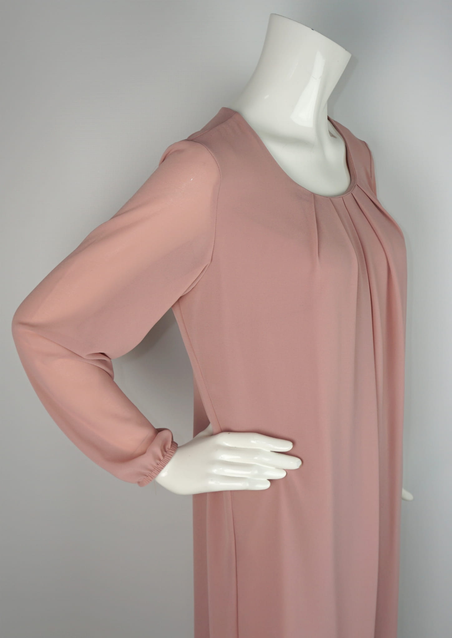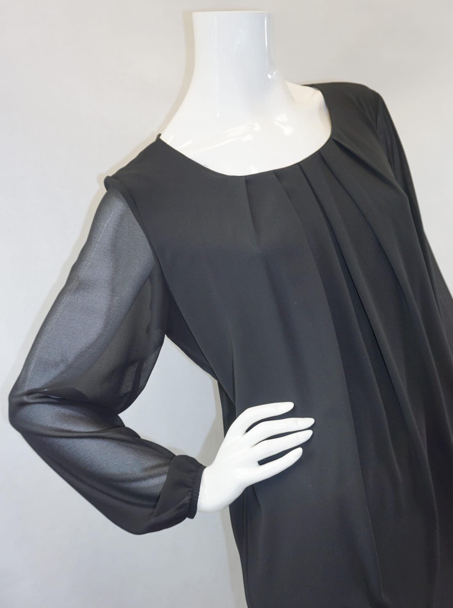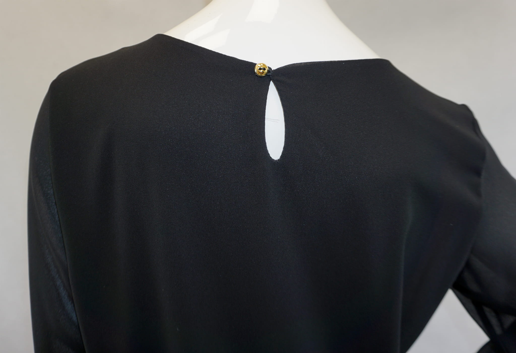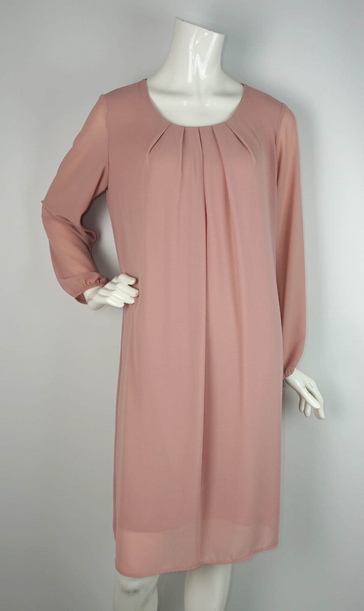 Model posiada okrągły dekolt z delikatnym marszczeniem, zapinana z tyłu na guzik.