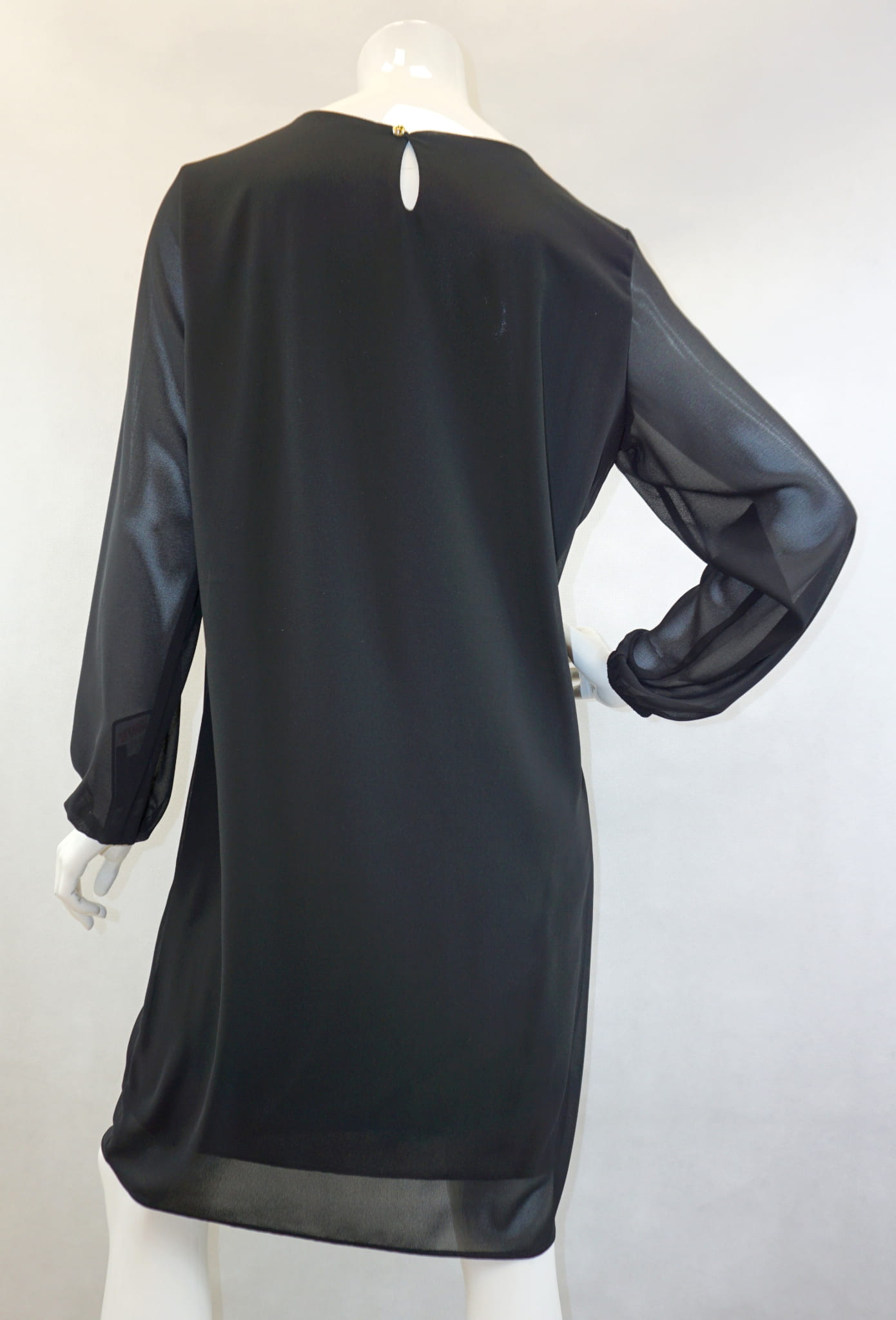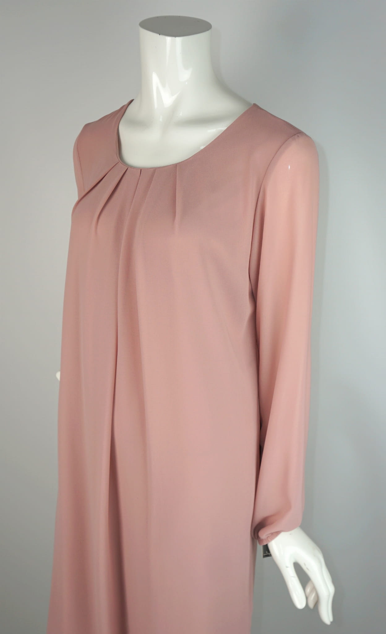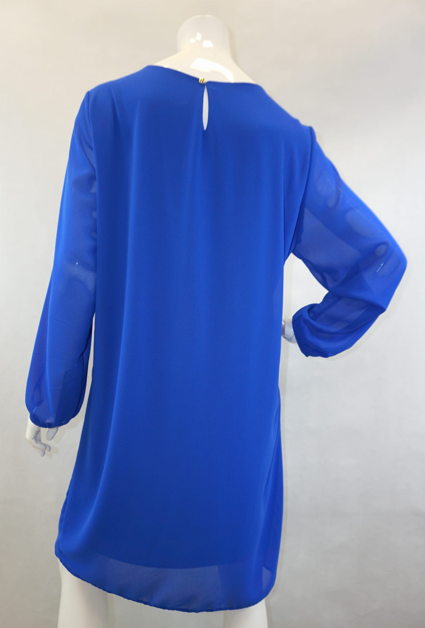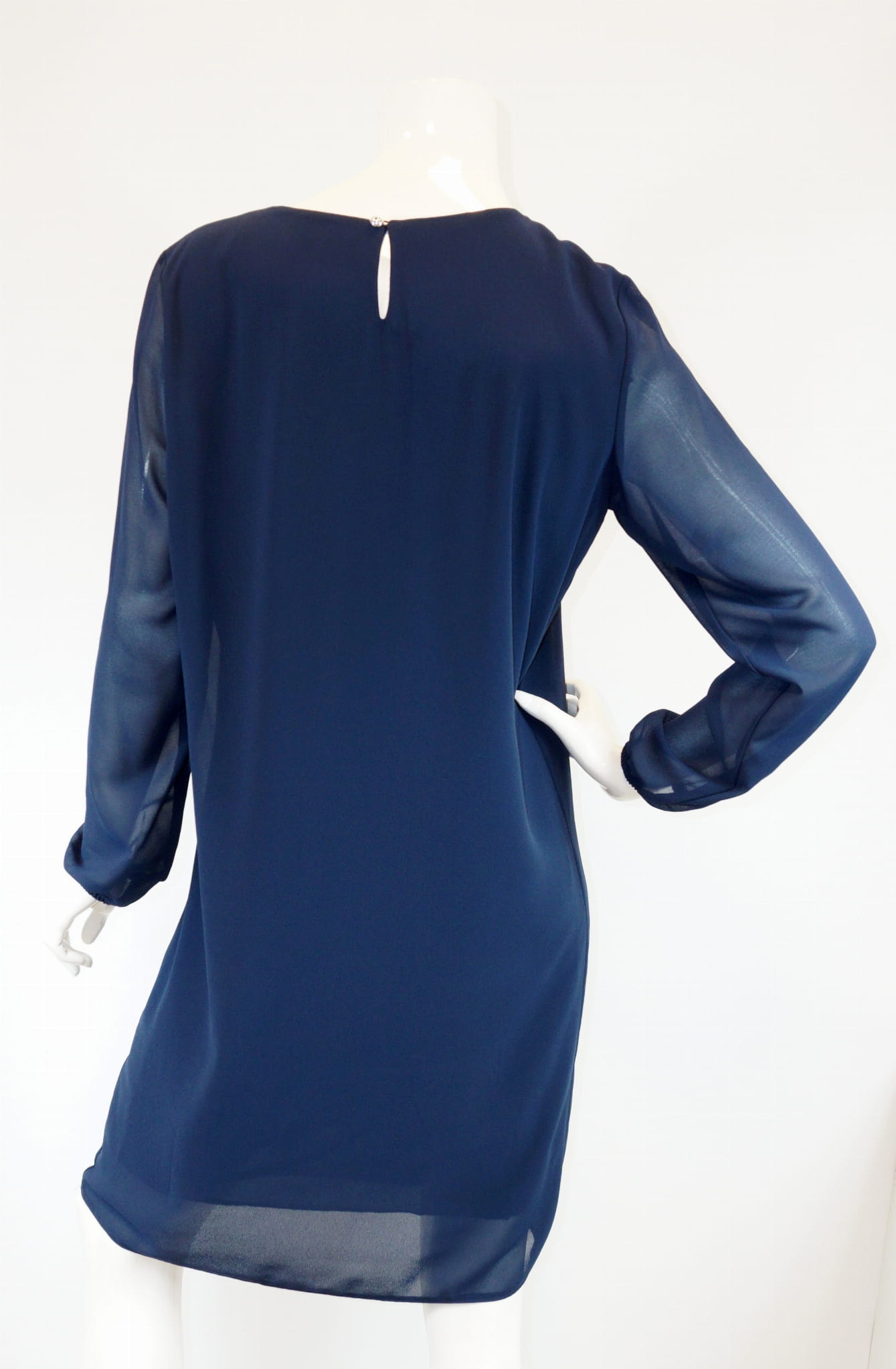 Model posiada okrągły dekolt z delikatnym marszczeniem, zapinana z tyłu na guzik.