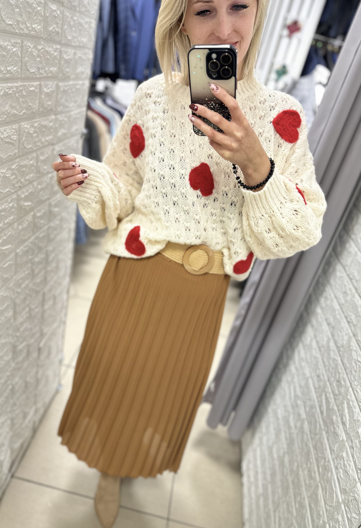 Luźny, wygodny sweter z charakterystycznymi sercami. Wykonany z lekkiego, przyjemnego materiału. Rozmiar UNI odpowiedni od M do 2XL.
