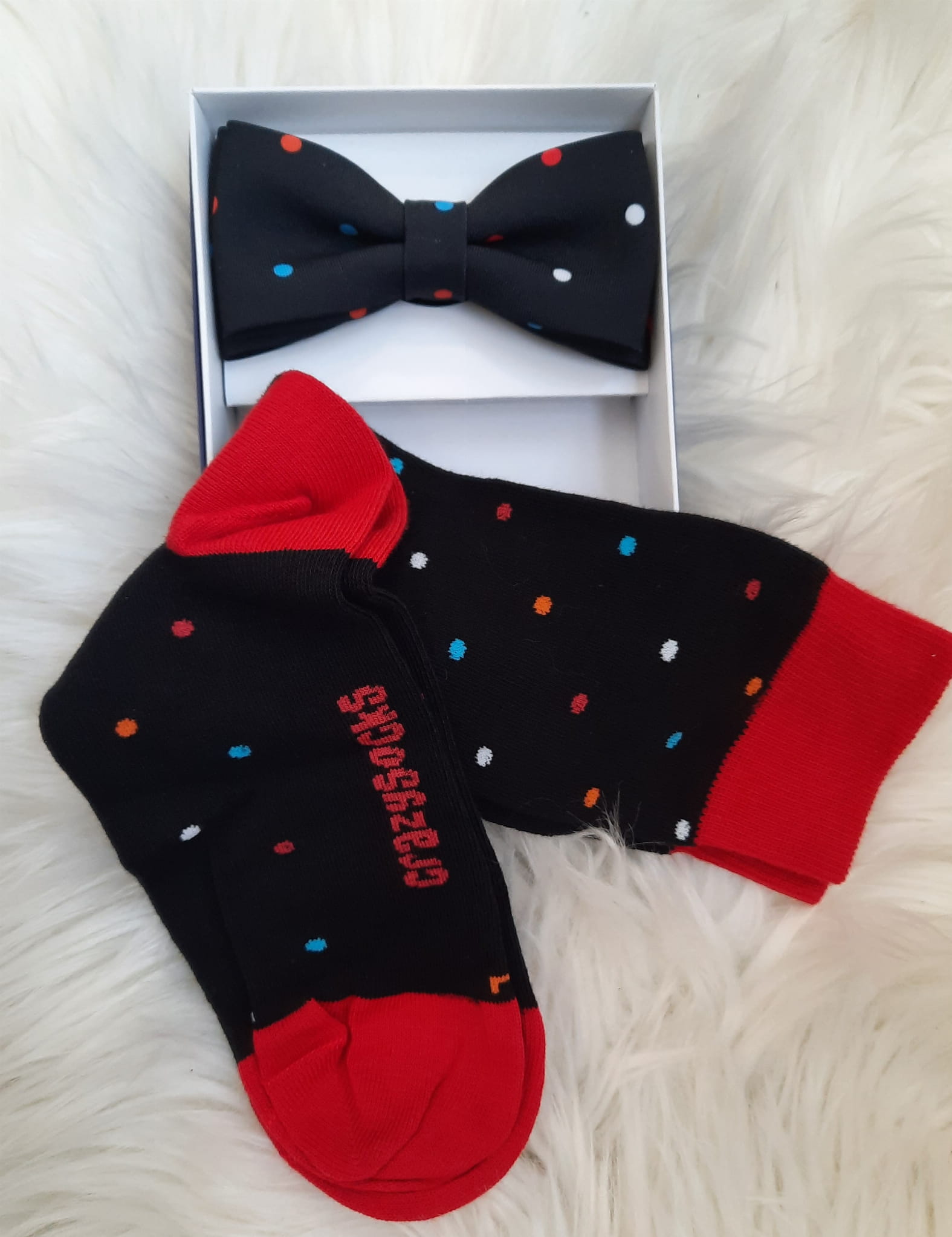Komplet mucha ze skarpetami z tym samym motywem.